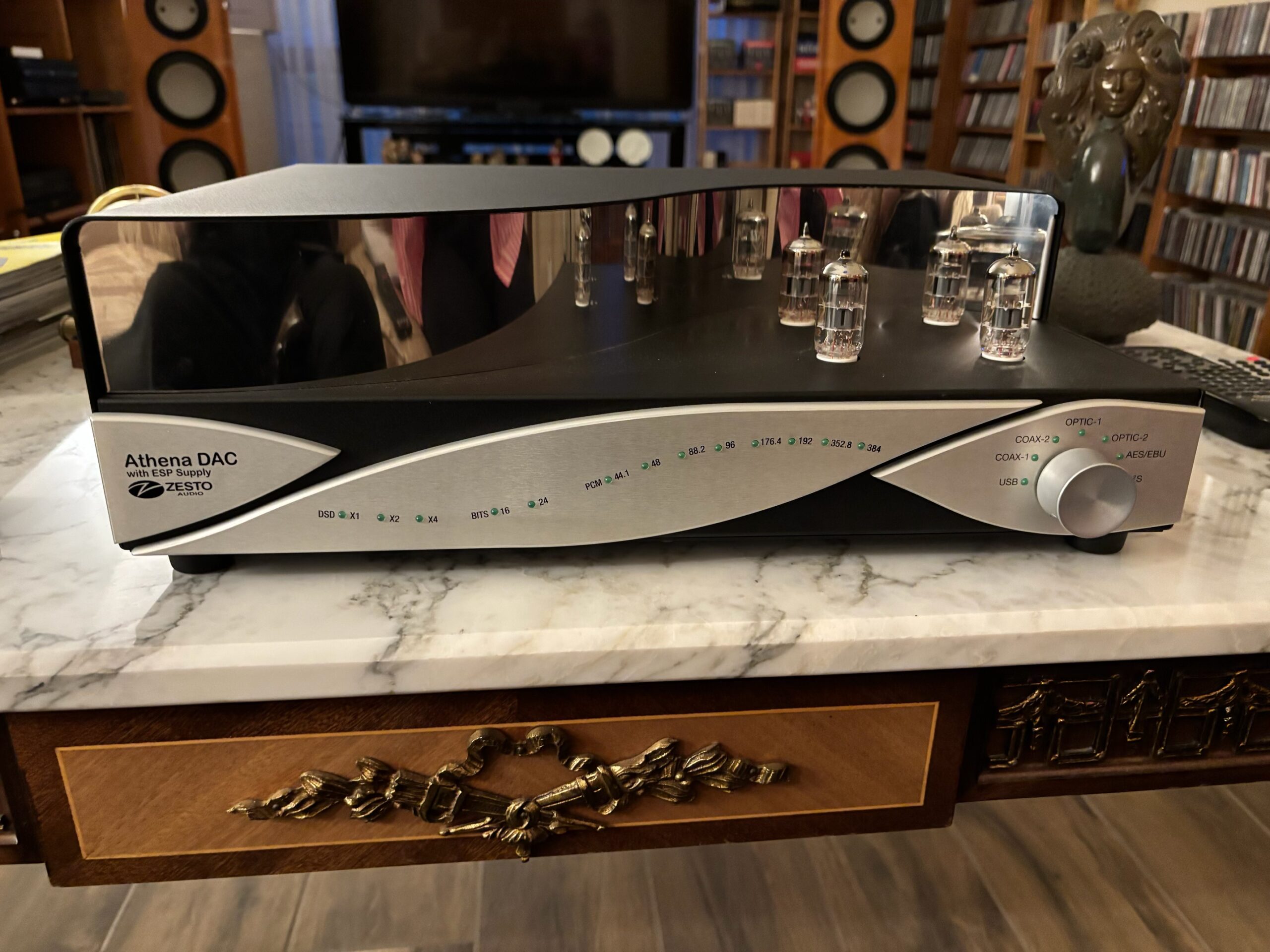 In for review world premier model 001 Zesto Audio Athena DAC with all tube output stage. With an output topology very similar to the Zesto Audio Lido preamplifier, this amazing new DAC is the one audiophiles have been longing for. Featuring the brand new ROHM DAC made in Taiwan and only four small signal tubes, it will decode any bit rate I have ever heard of including four times DSD. Every bit rate from compact disc and above is decoded in native with no up sampling. In addition to a convincing light show giving you decode information on the front panel, every kind of output and digital input I have ever heard of is available on the back selected by a control from the front.