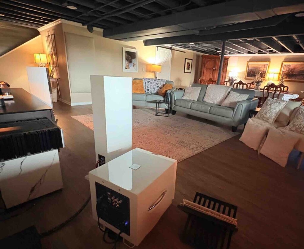 When we moved in, the sparse, concrete basement had three AC outlets–one for the sump pump at the rear and two in a small steel box bolted to the circuit breaker panel in the middle of the front wall, from which I ran two heavy duty indoor/outdoor extension cords to the towards the alcove at the rear left side; one connected to a Pass Labs X150.8 amplifier and the other to a Panamax M5300-EX power conditioner feeding other electronics on a Simpli Home Skyler media stand and a Hsu Research ULS-15 subwoofer next to it. A pair of tall Usher Audio Mini Dancer 2 speakers flanked an 8' x 10' shag rug, acoustic panels lined the alcove's walls, and a leather couch for listening was parked at its entrance. Sometimes, we watched a small TV in that intimate space for a more immersive experience.