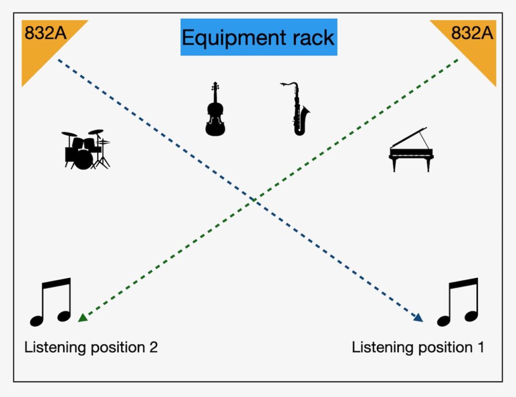 If I'm in listening position 2, the right Corona loudspeaker is firing directly at me diagonally across the room from about 20.5' away, and I see the front of the right Corona as in the photo below.