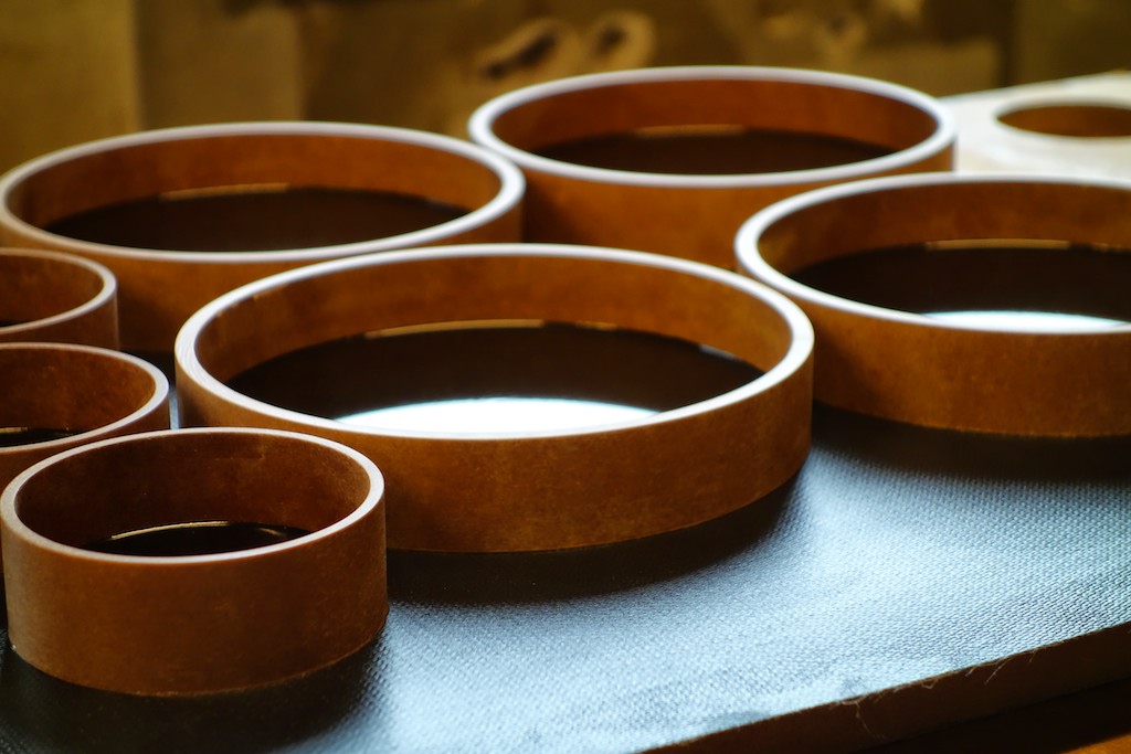During this process, a ring of vacuum-impregnated paper has been readied with a base of CAST material. The coiled foil is then heated and placed in the ring and base assembly, and CAST material is poured on top of it in five stages. A precisely controlled flame is then quickly applied over the surface to drive any air bubbles out of the CAST material.