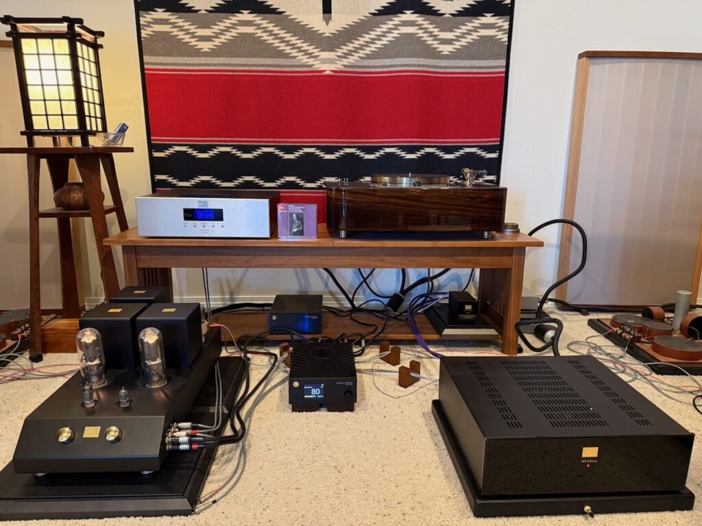 The Audio Note (UK) CD 5.1x CD player is the digital source, and the vinyl source was my custom CTC Garrard 301 / Artisan Fidelity turntable with a high-mass brass platter, a Schick tonearm equipped with the Audio Note (UK) Io I moving-coil phonograph cartridge, connected to the AN-S8/L SUT, and to the M8 RIAA phono pre.