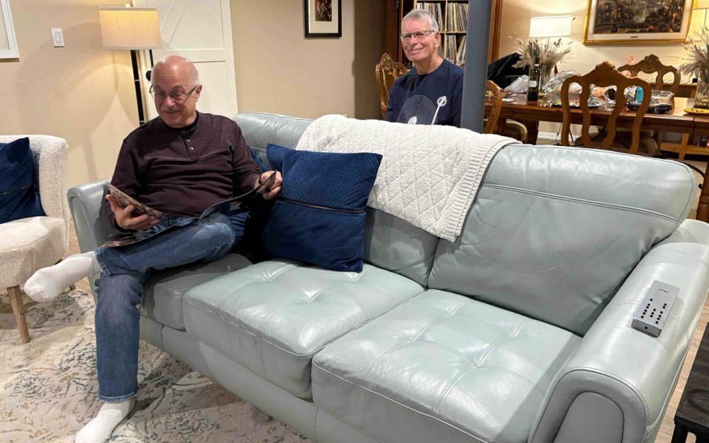 Bob, at left, leafs through a booklet from the Jimi Hendrix album, while Jeff enjoys the music from a chair just behind the listening couch—easily within striking distance of the grazing table at the rear of the room!