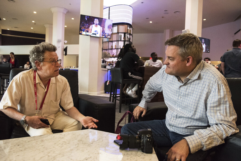 Michael Fremer and Lee Scoggins, a moment. Los Angeles, CA, 2017. (Photograph and image processing by David W. Robinson)