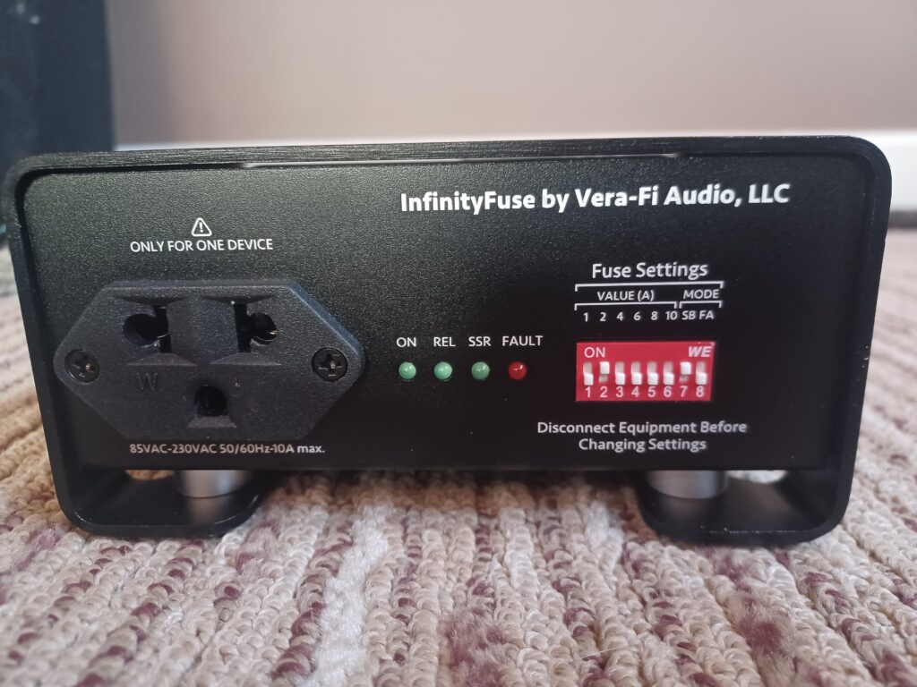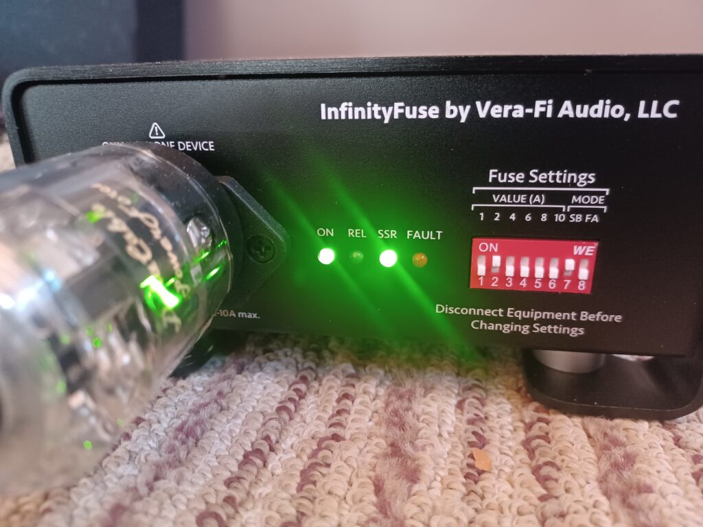 Install was easy. Pull my old single-use fuses out of the amp's fuse holders and put the Graphene Sluggos in. Put them back in the amps and tighten. Configure the DIP switches for 2-amp slow blow. Plug the IF into the wall, and plug the amp's power cables into the IF. Vera-Fi Audio suggests a minimum 40-hour break-in period for their audio products, including the Infinity Fuse, with improvements potentially continuing up to 400 hours.