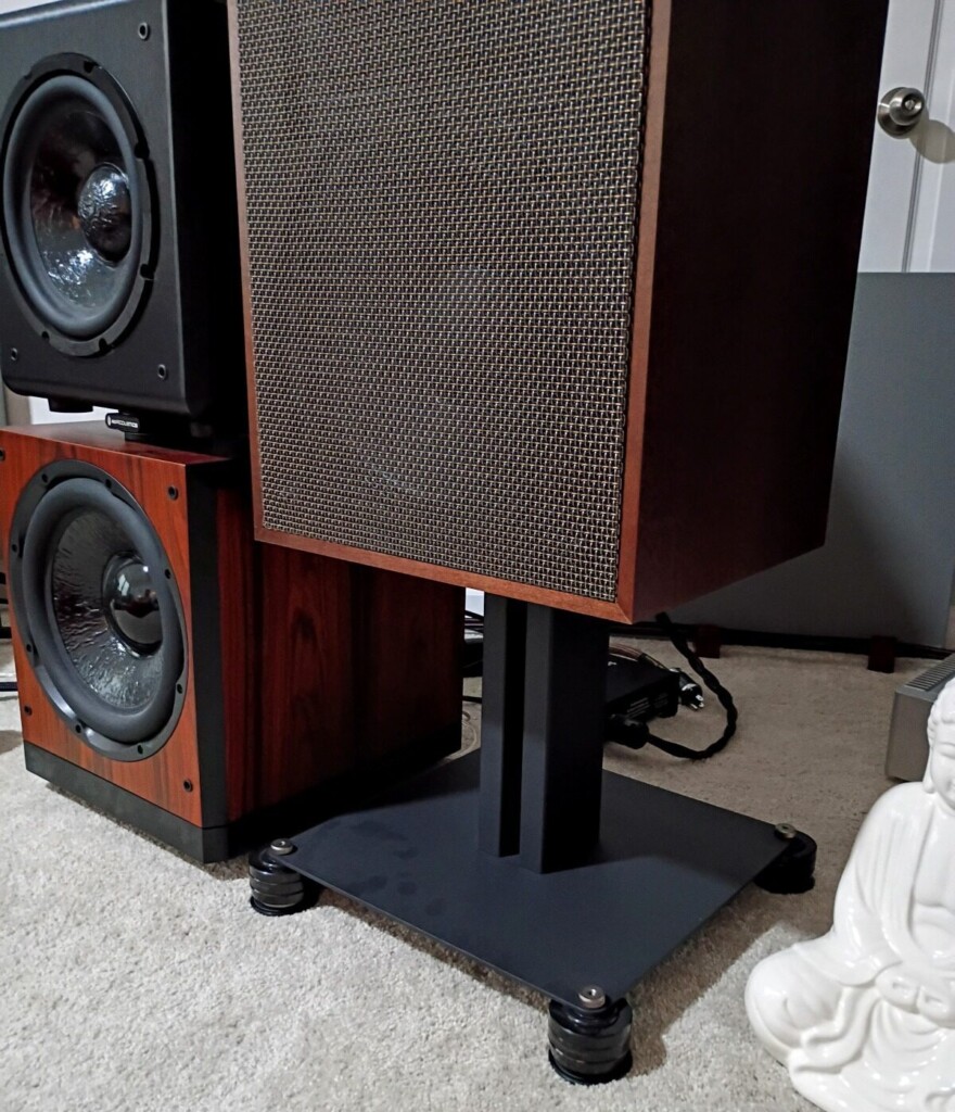 The Heresy IV's ran concurrently in my system with a quad of Vera-Fi Audio Caldera subwoofers, and were situated for months alongside a pair of SVS Ultra Evolution Tower Loudspeakers that were also in for evaluation. And I regularly switched between powering the two pairs to assist in breaking each of them in, as both arrived brand new with zero hours on them. Heresy's lovely new American Auburn finish is dark, but not so much as Klipsch's black ash finish, and you can really see the beauty of the woodgrain in the veneer. My evaluation commenced with the Heresy IV's attached to the KS-12 stands, and they remained in place for the vast majority of my listening. The metal stands were also fitted with the IsoAcoustic GAIA Neo II isolators that arrived not long after the Heresy IV's appeared—you can read my review of the GAIA Neos HERE. Late in the review, I also listened with only the Heresy's stock risers attached—more about that in just a bit!