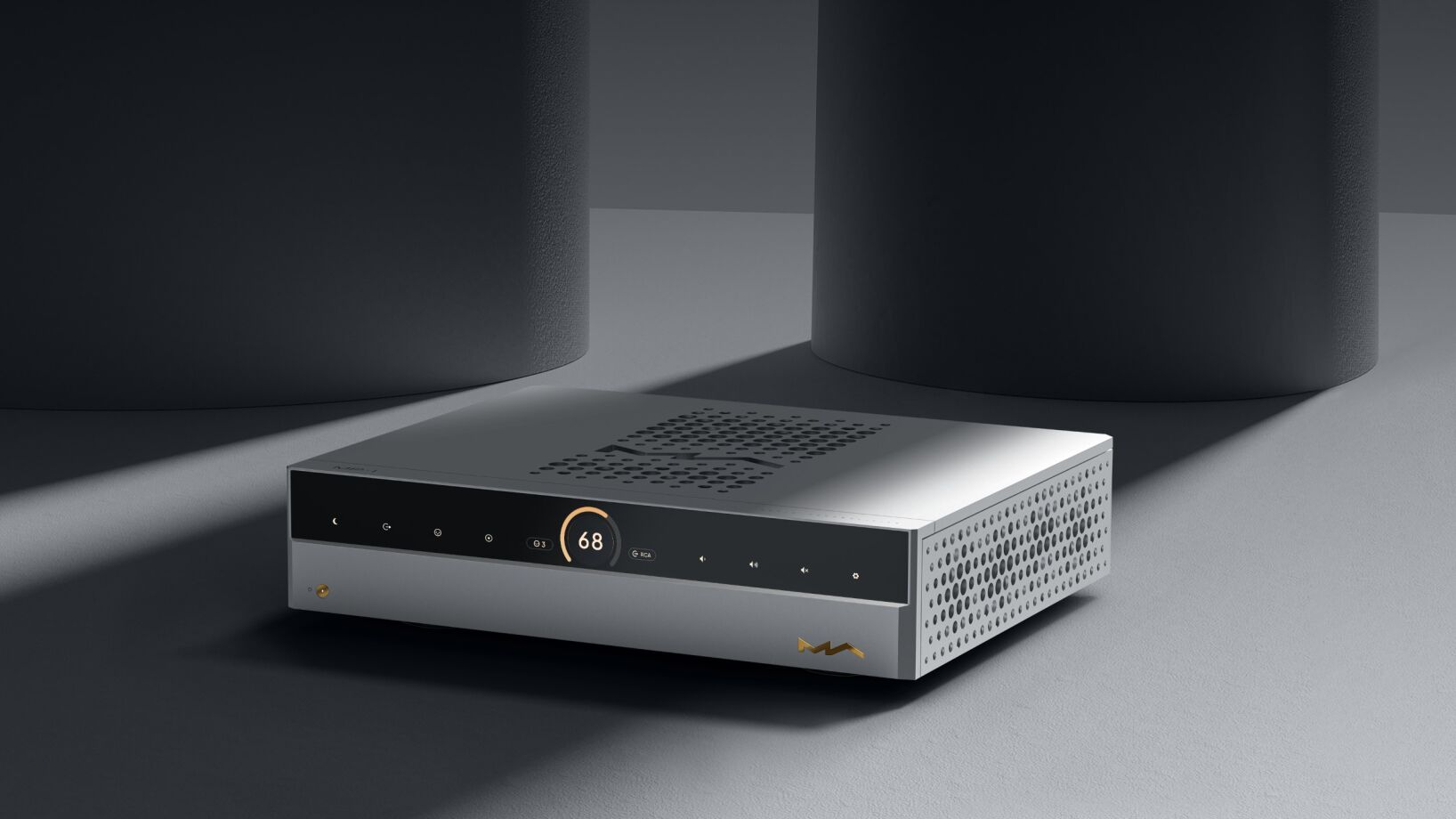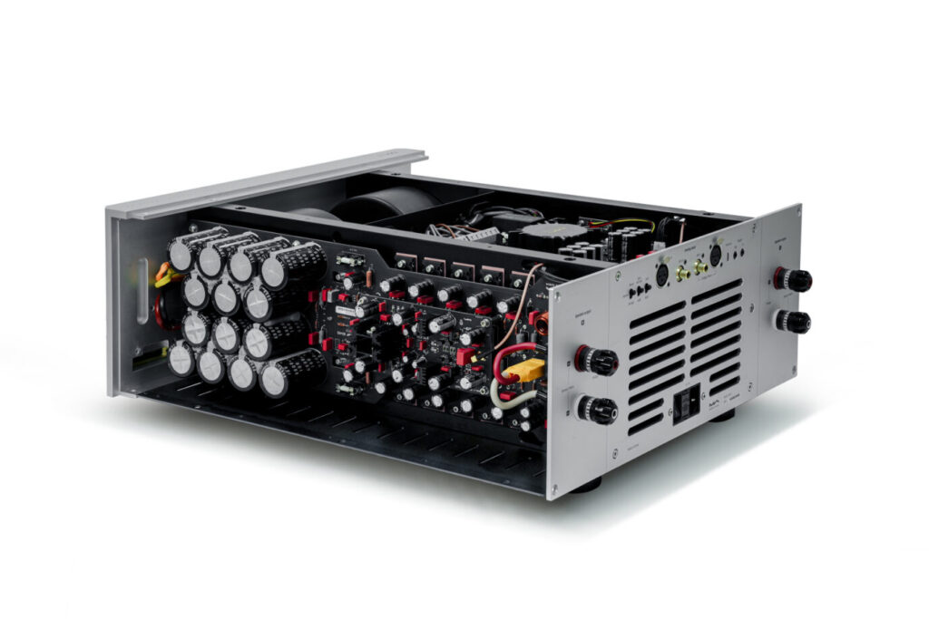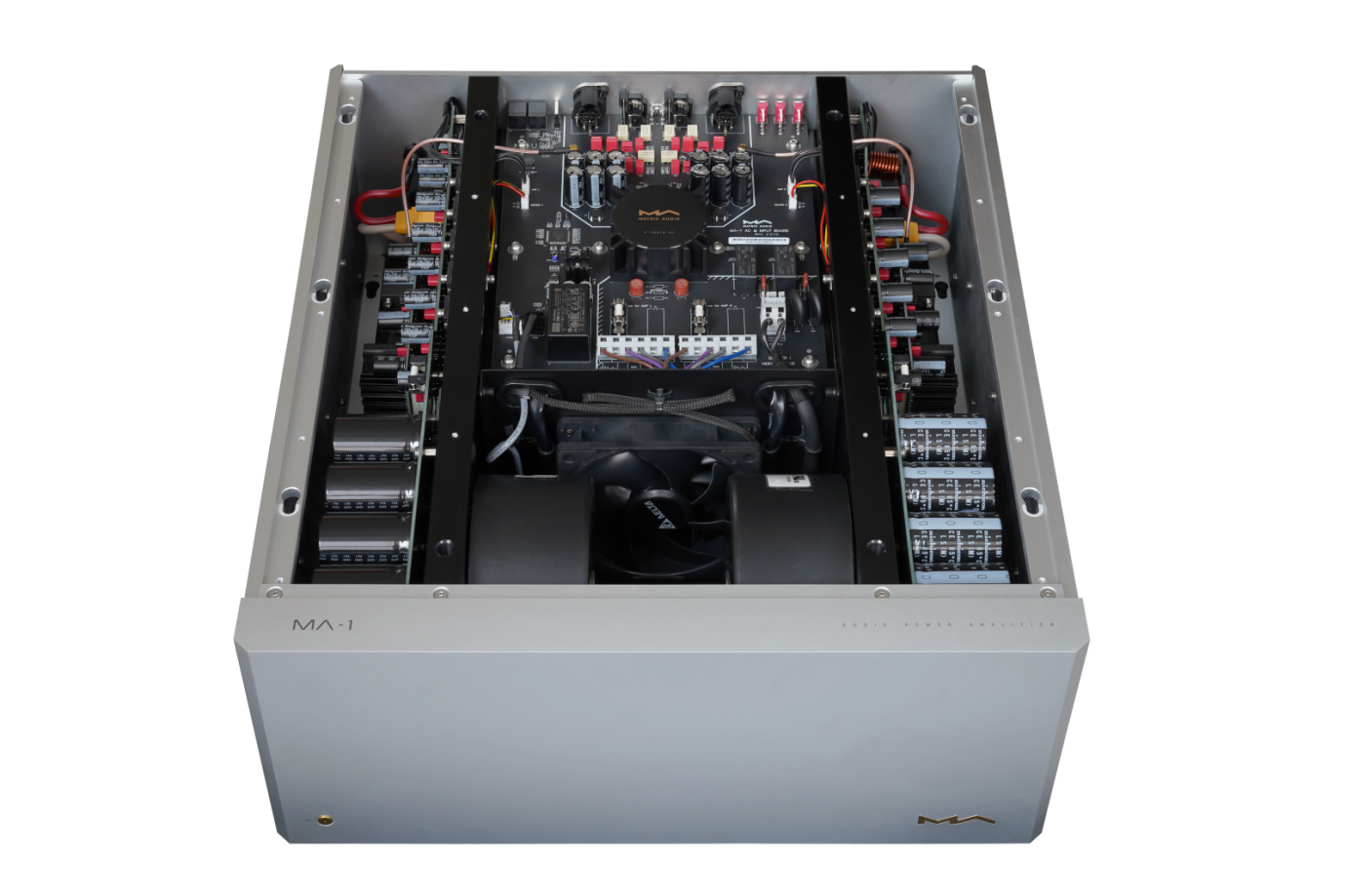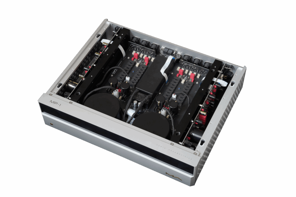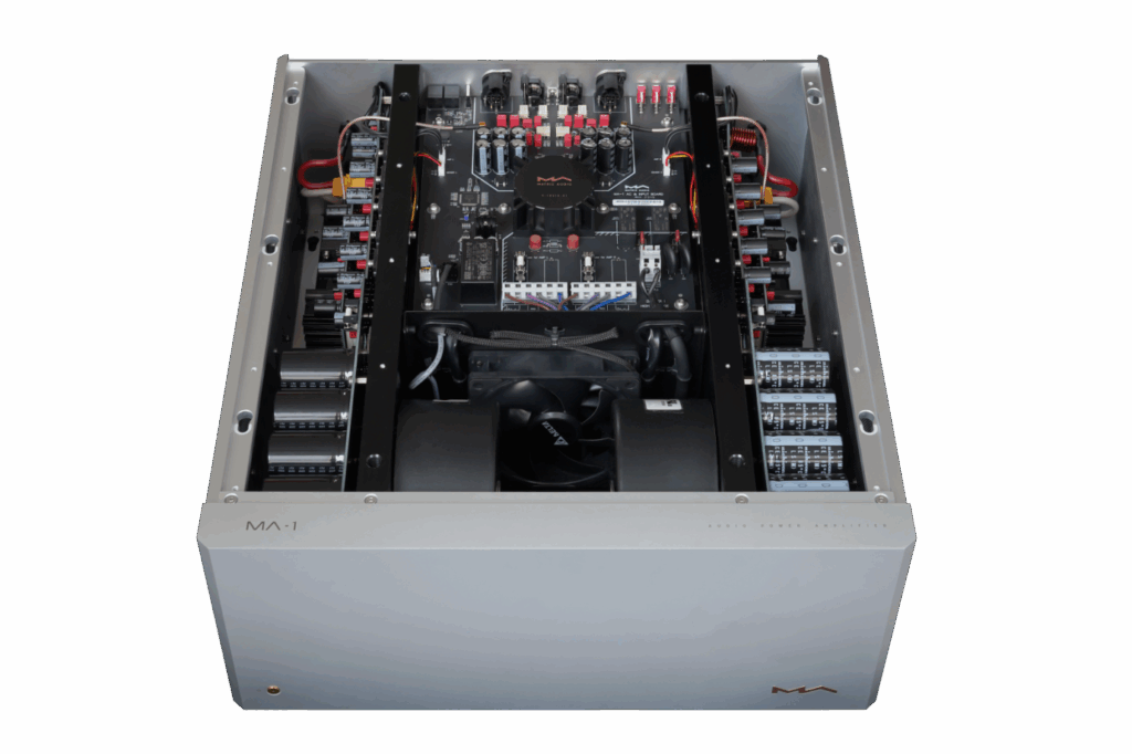 Power output of the MA-1 amplifier is 250 WPC into 8-ohms and 450 WPC into 4-ohms. The amplifier uses 10 ONSEMI transistors per channel. The amplifier is a Class A/B design that remains in Class A for a significant portion of its power range. The amplifier has true dual mono architecture, with independent power supplies for each channel. Each channel contains a 625 watt toroidal transformer and a bank of 14 capacitors with 190,000 µF of capacitance. Furthermore, each channel has separate power supply circuits for the input and amplification stages of the amplifier.