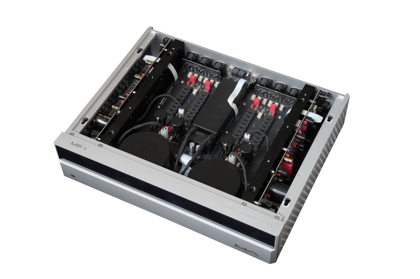 The MP-1 preamplifier is a Class A design that uses a fully differential transistor input stage circuit that maintains excellent linearity and a low noise floor. The fully balanced circuit uses two independent amplification boards for each channel. This is a direct coupled design with no coupling capacitors in the signal path.