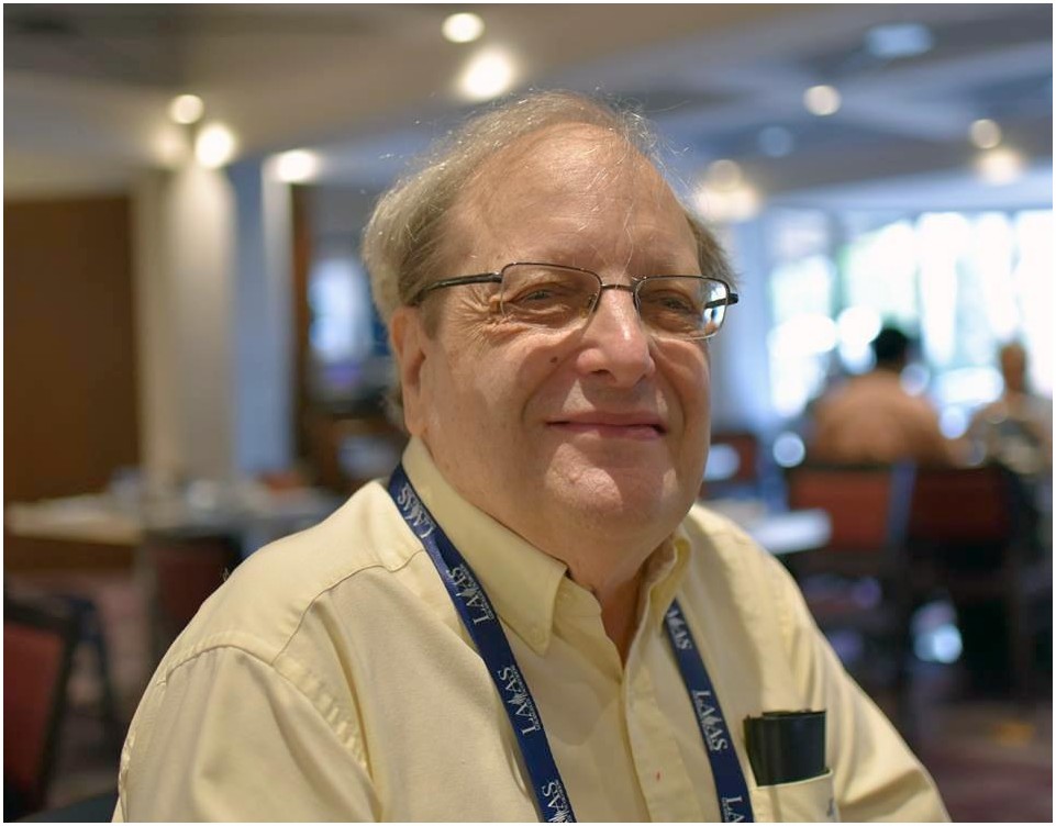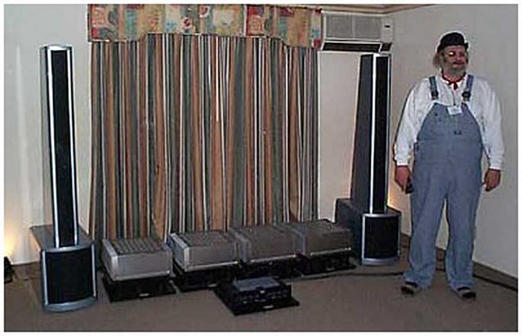 The late Bob Crump, showing four of the original prototypical Parasound HALO JC1 amplifiers at CES in January of 2002