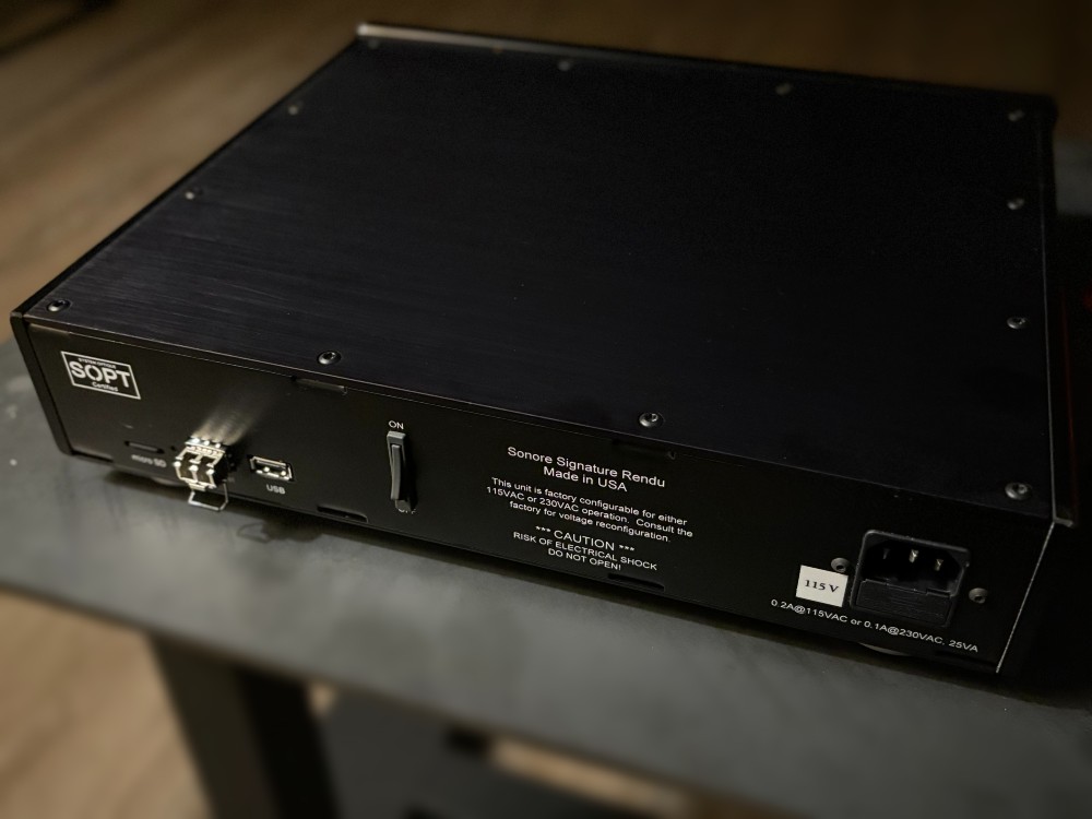 The Sonore Signature Rendu SE Deluxe, with its single enclosure of its optical Rendu transport and Signature Power Supply, is, according to their literature, the "absolute finest streaming USB source" they have made to date, achieving a very low-noise power delivery to a connected USB DAC by integrating the two components and incorporating a linear power supply, a redesigned circuit board, and an optical Ethernet input to eliminate network noise. Moreover, a stainless steel barrier inside the chassis acts as a Faraday cage, protecting processing circuitry from potential electromagnetic and radio frequency interference.