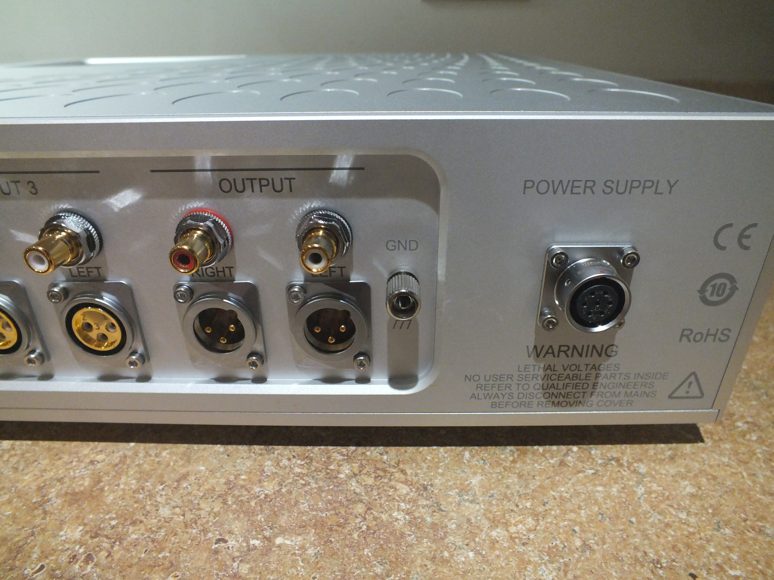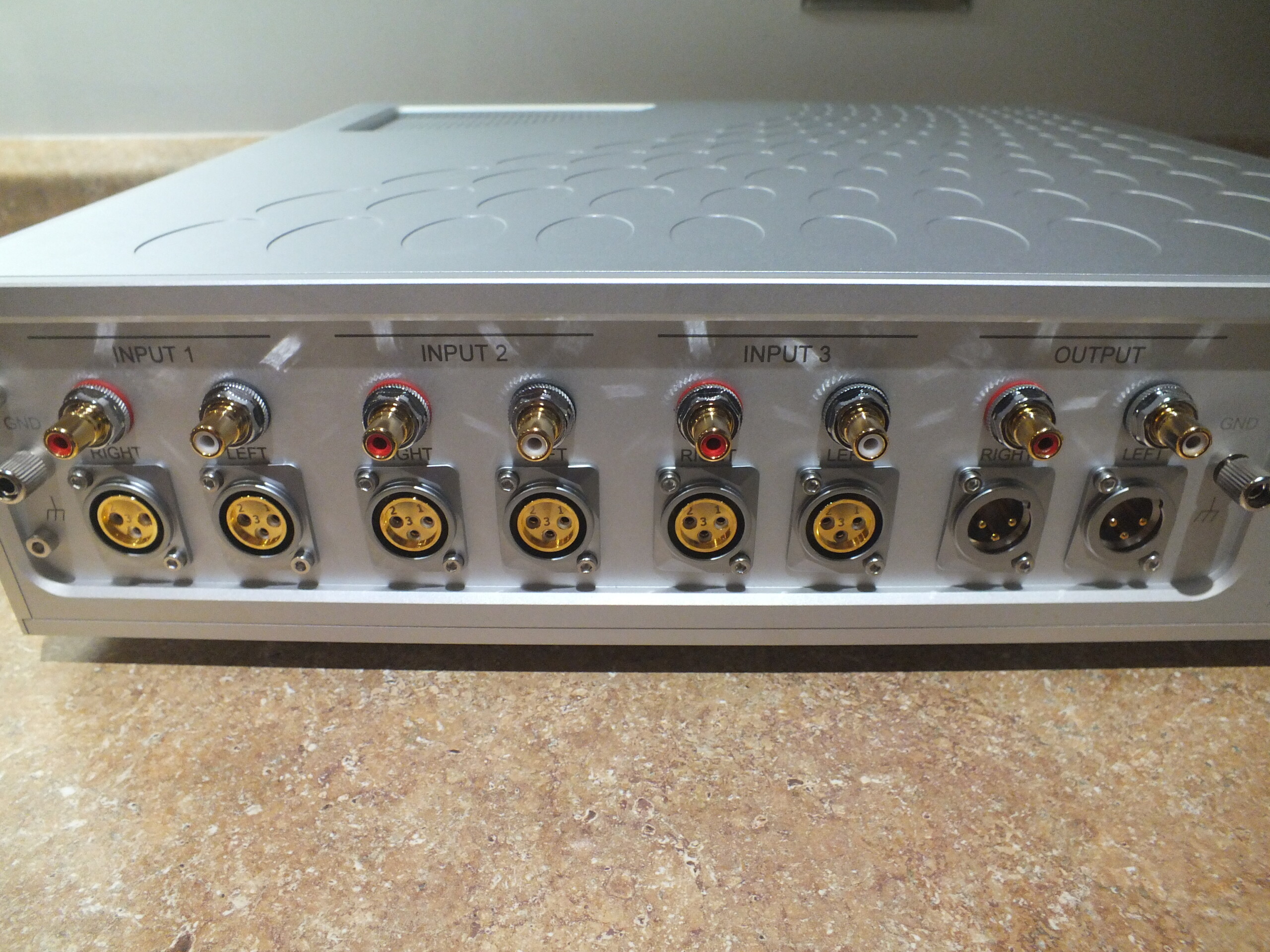The rear panel has three pairs of RCA inputs, three pairs of XLR inputs, one pair of RCA outputs, and one pair of XLR outputs. The same group of RCA or XLR plugs cannot be used at the same time. Two grounding posts are also included. The three inputs can concurrently be hooked up to three different turntables or three different tonearms. Each of which can be adjusted individually to maximize the performance of any chosen cartridge.