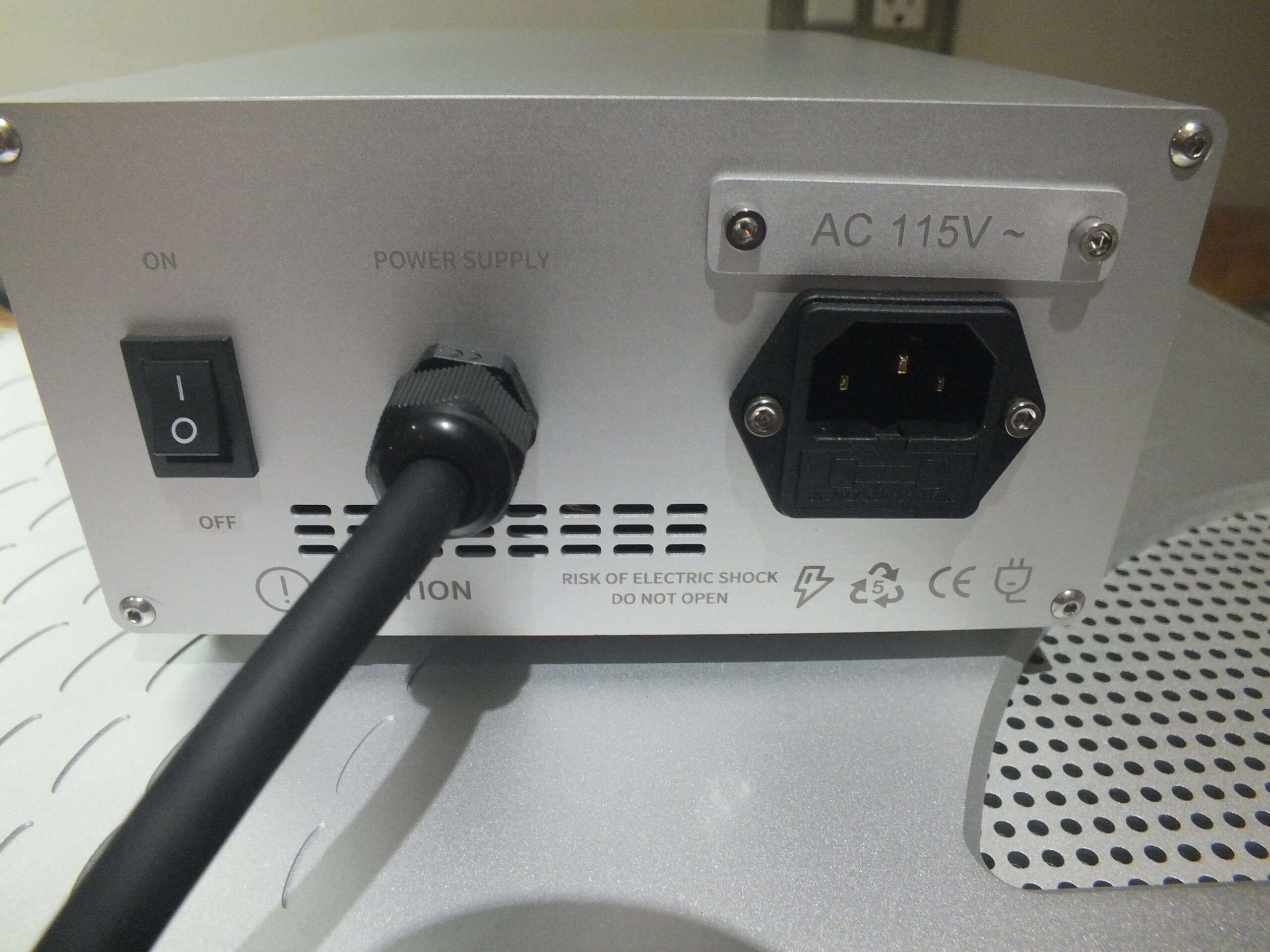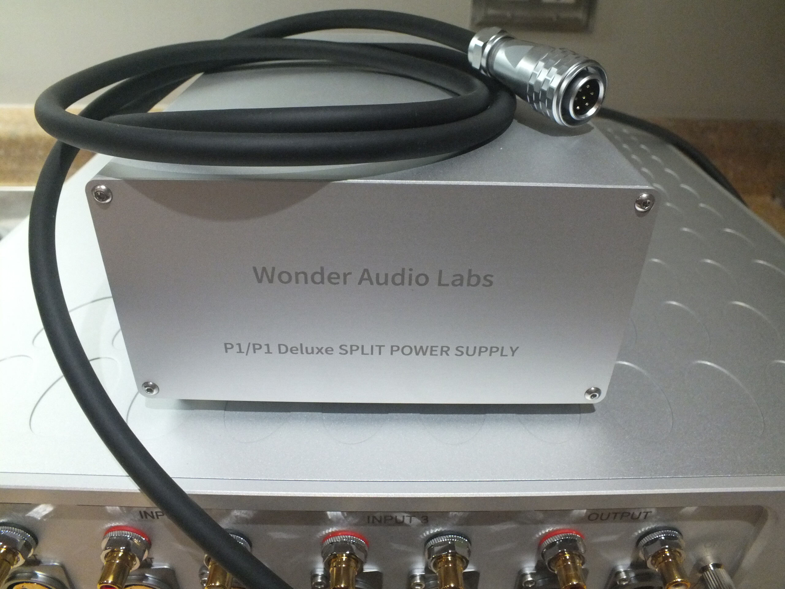 Improving upon the original P1, the newer upgraded P1 Deluxe phono stage uses an outboard power supply (PS). The PS connects to the main unit via a custom 2.0m length multi-pin cable. The outboard PS measures 22.25cm (8.75") deep, by 8.25cm (3.25") high, and 15.875cm (6.25") wide. It has one 15-Amp male IEC plug.
