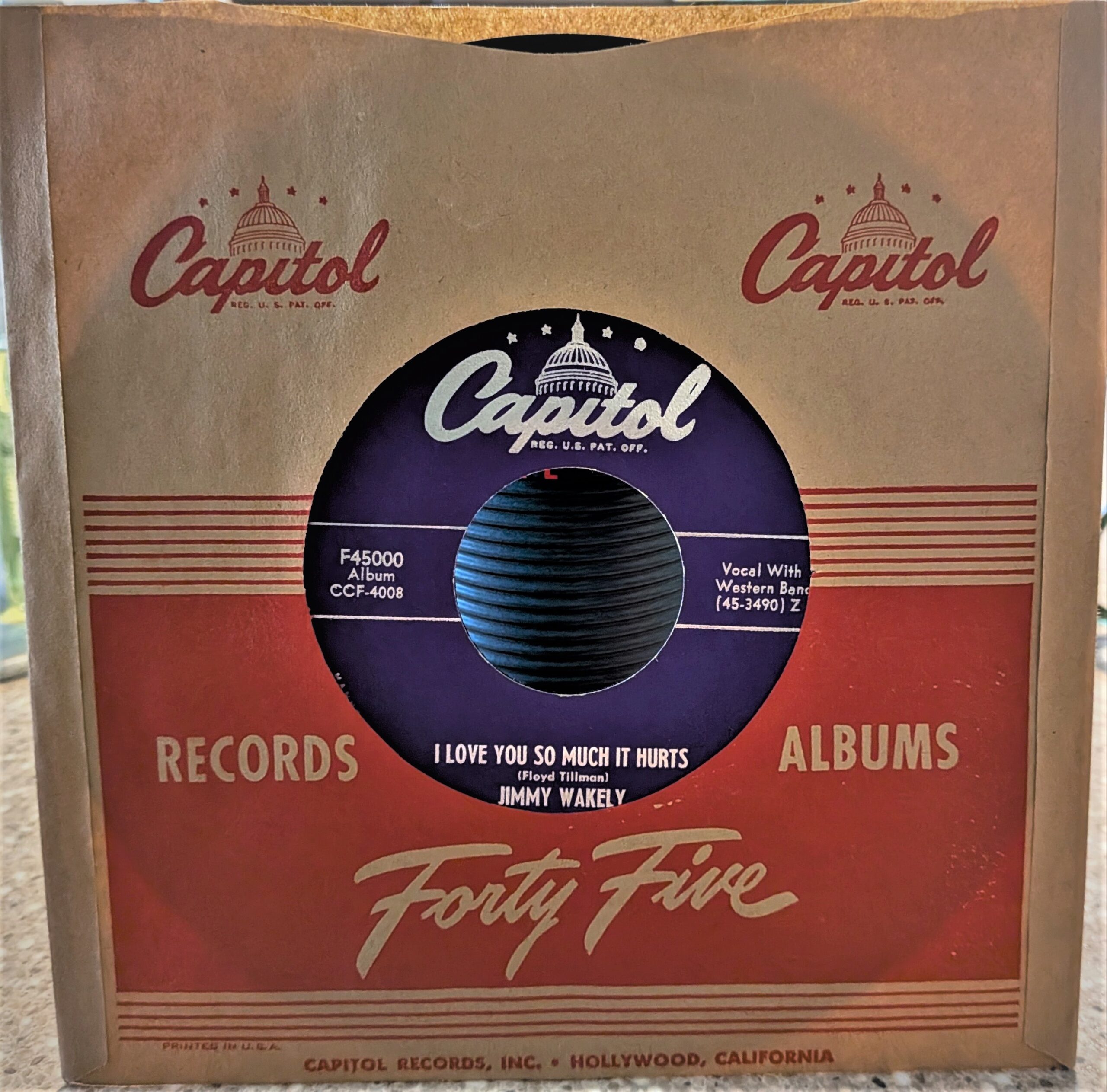 Pardon me while I switch formats, because there's another Wakely title that deserves attention. It's a CD called Jimmy Wakely Vintage Collections (Capitol 24383-65912). It contains twenty cuts, and  four of them are the above-mentioned cuts. I can't remember whether I found this title before or after Songs Of The West, but over the years, as I upgraded my audio system, the CD's denoising on these cuts has become more noticeable. In fact, this is what drove me to reevaluate Songs Of The West. As I previously stated, there was a time when the 45 set didn't sound good. It sounded noisy and lifeless. Today, Songs Of The West has very little in the way of surface noise and the sound is excellent. What little background noise I can detect is a much better alternative to the airless sound of digital denoising. The CD has plenty of other material that continues to make it an asset to my music collection. Let me tell you about it.