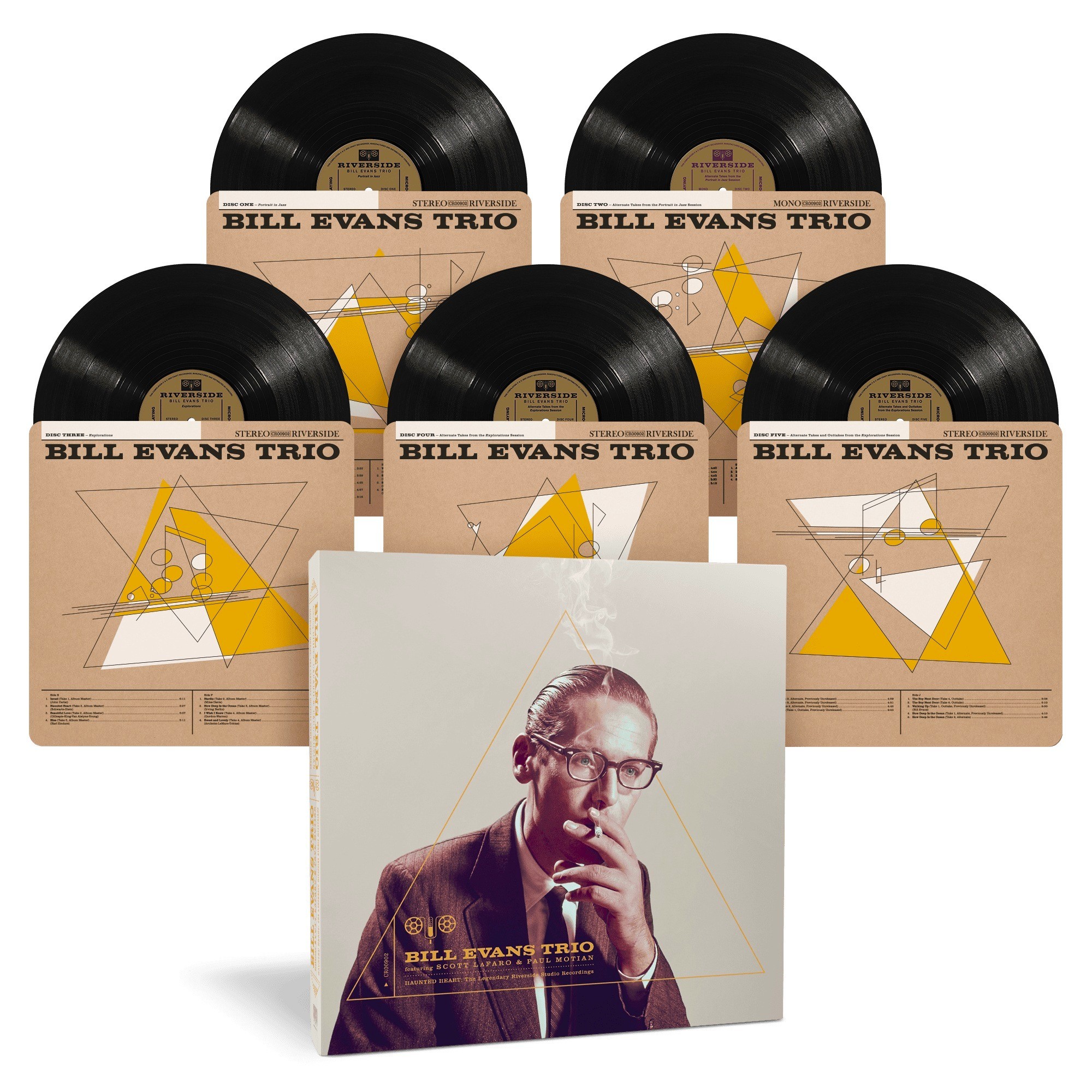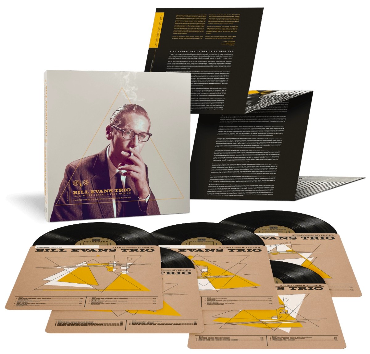 Haunted Heart: The Legendary Riverside Studio Recordings's elaborate packaging includes a satin varnished, foil-stamped outer slipcase, with two expanded, single pocket album jackets inserted. Those jackets are extensively die-cut across their faces with the same triangular motif featured on the outer slipcase; that allows slipsheets featuring the original album art for Portrait in Jazz and Explorations to respectively show through each jacket. The jacket for Portrait in Jazz contains two LPs; one with the original studio LP, and a second with the alternate takes. While the jacket for Explorations contains three LPs, with two additional discs of alternate takes (the sessions for this album were difficult by all reports, with multiple takes of almost every tune). Each LP is inserted in a stylized, printed paperboard inner sleeve that's surprisingly lined with a rice-paper insert (nice touch!). An accordion folded insert features a stylized poster of Bill Evans on one side, an introduction by Door's drummer John Densmore (he actually snuck into Shelly's Manne-Hole as a teen to see this trio!), and an informative and entertaining essay from jazz writer Eugene Holley Jr (Downbeat, Hot House Jazz Guide, SFJAZZ). Haunted Heart: The Legendary Riverside Studio Recordings is one of the most visually striking box sets I've ever come in contact with!