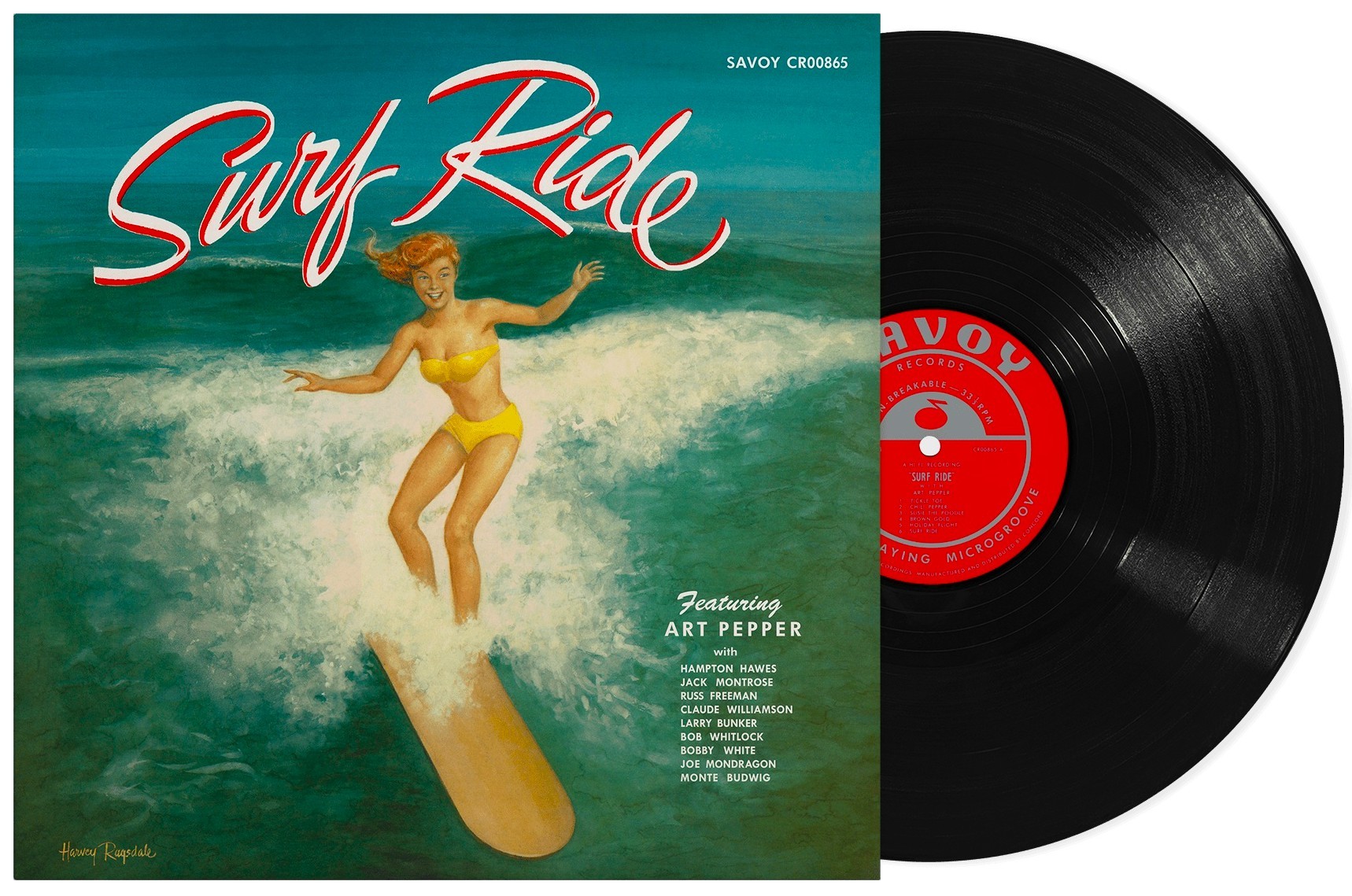 Alto saxophonist Art Pepper first came to prominence playing in Stan Kenton's big band; Surf Ride was his 1957 debut as a leader on Savoy Records. A practitioner of West Coast cool jazz, he often gave emotionally charged performances and is regarded as one of the greatest alto sax players—if not the greatest—of all time. Pepper struggled with drug addiction throughout his career, and often had long stints of inactivity as a result—that could possibly explain why it took a year-and-a-half to complete the recordings for Surf Ride, which took place over several sessions from March 1952 to August 1954. The Los Angeles recordings were supervised by Ozzie Cadena for Savoy Records, and were also (surprisingly) engineered by Rudy Van Gelder. In addition to Art Pepper on alto sax, side one featured Russ Freeman and Hampton Hawes on piano, Bob Whitlock and Joe Mondragon on bass, and Bobby White and Larry Bunker on drums. For side two, Jack Montrose appears on tenor sax, Claude Williamson is on piano, Monte Budwig is on bass, and Larry Bunker hangs around behind the drum kit. Other than a 1991 CD release and a limited LP reissue in 2016, Surf Ride has been out of print domestically since its 1957 release.