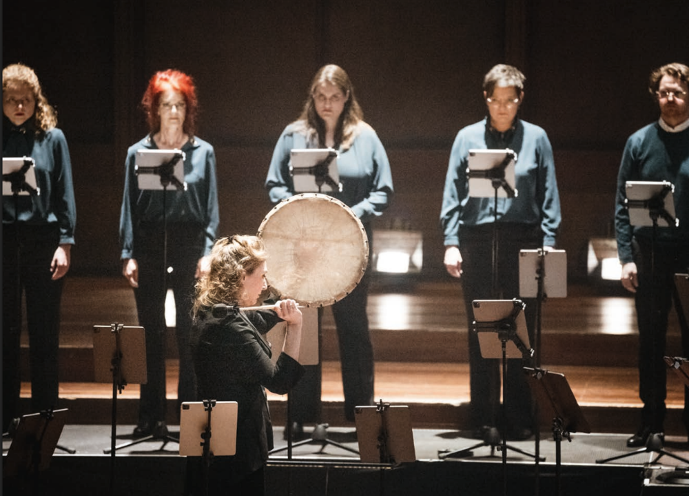 Amsterdam Sinfonietta director Candida Thompson on shaman drum in performance by the Netherlands Chamber Choir of Veljo Tormis' Curse Upon Iron, track 3.