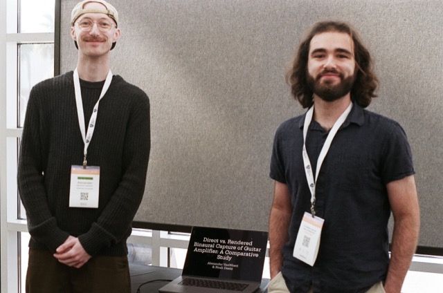Another odd poster was "Direct vs, Rendered Binaural Capture of Guitar Amplifiers." Alexander VanWert and Noah Deetz from American University recorded a guitar amplifier with an omni measurement microphone and a binaural head in the same location. Then they used the standardized HRTF of the binaural head to "spatialize" the mono microphone as if it was in the center of the soundfield. People on the whole preferred the actual binaural recording, presumably because the room effects were recorded accurately with the binaural head whereas the mono recording contained only mono room cues that could not be accurately spatialized. The difference was greater when the microphones were pulled back six feet than when they were recorded two feet away, presumably because the increased amount of room effects exaggerated the differences.