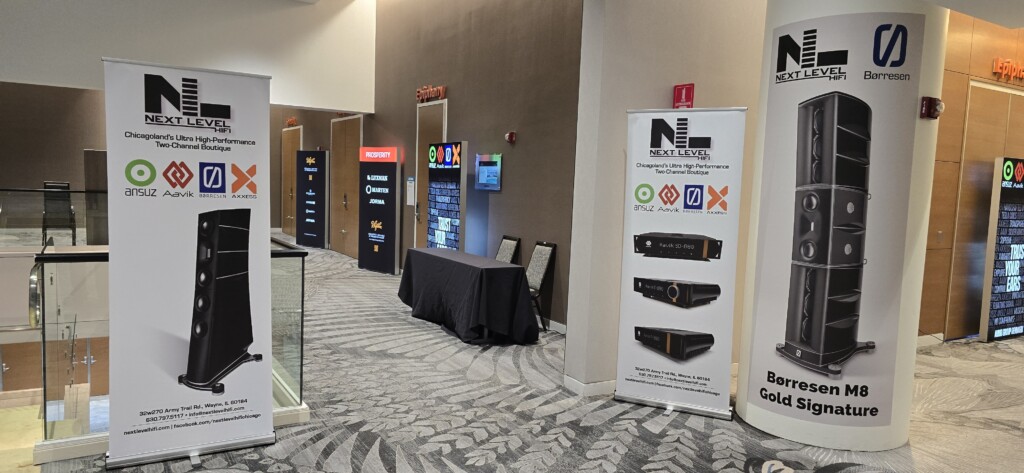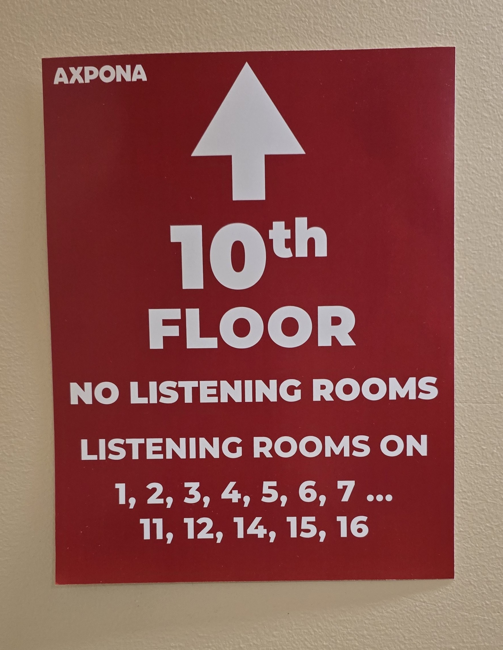 First off, about the show itself. AXPONA is held here in the 'burbs of Chicago, in Schaumburg, Illinois, about 20 miles (and an hour + drive) north-west of downtown. The Renaissance Hotel and Convention Center play host to this not-so-moderate gathering. This show is a bit of a unicorn (in more ways than one, I suppose) in that it doesn't function in the way that most conventions would work. The regular flow of patrons doesn't fit the mold in the same way that a more 'traditional' convention would work, where occupants would rise the morning, head down for breakfast, then head next door to the convention hall before retiring back to their rooms near days end. Here, the 16-story hotel is divided into three floors for guest rooms (floors 8 thru 10), and other floors (1 thru 7, and 8 thru 16) for listening rooms. In addition to the large rooms and expo halls next door at the convention center proper, attendees spend much of the time moving from floor to floor in the hotel building to experience the various gatherings of equipment available. So far so good. But here's the catch: Elevators! Or lack thereof. The hotel building has (only) five guest elevators, which is likely sufficient for 'normal' hotel combination. For our show, the venue has to shut off unfettered elevator access to make the show work. Specifically the call buttons on each floor get disabled so patrons can't call (and thus delay) the elevators for uses other than moving people from the lobby up to the listening floors. So the ideal pattern would be to take an elevator from the lobby to the top floor and then work your way back down to the lobby via the stairways. You can wait in an elevator lobby on any of the upper floors, but you might be there awhile since you can't 'call' the elevators from that location. If you attend, be ready to walk stairs—a lot of them!