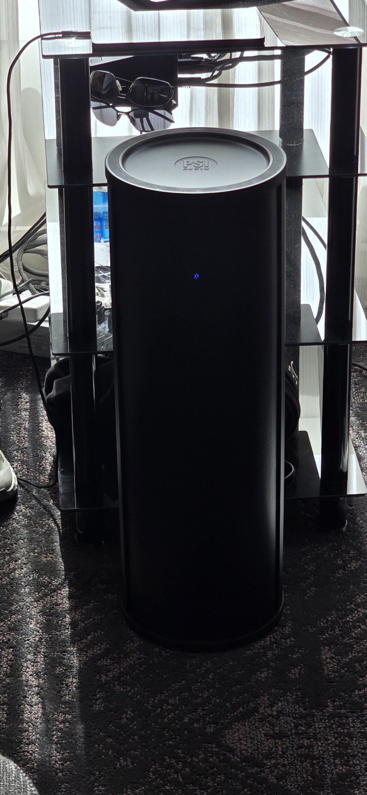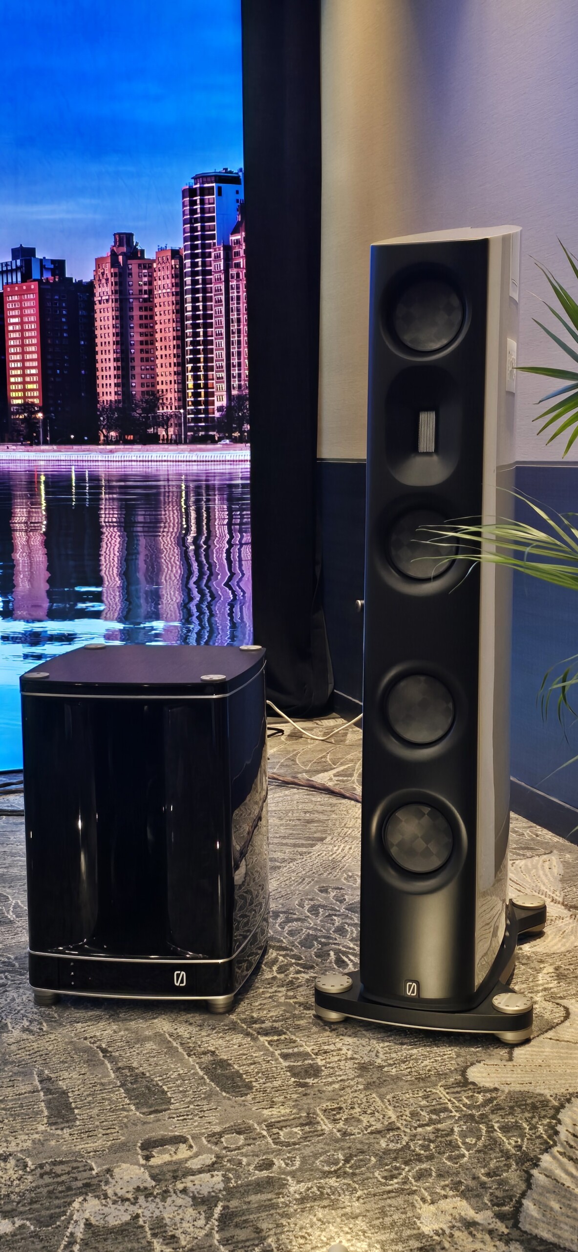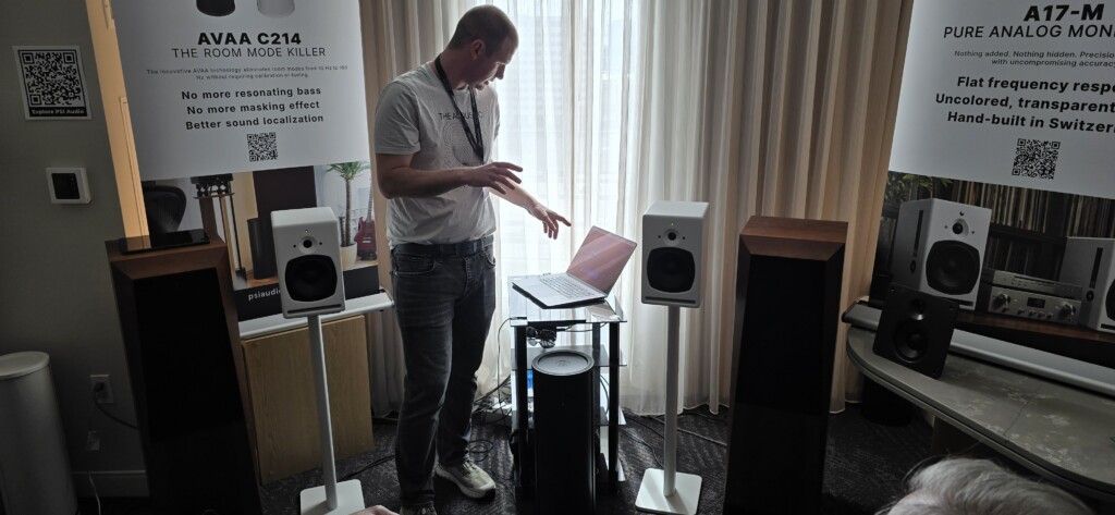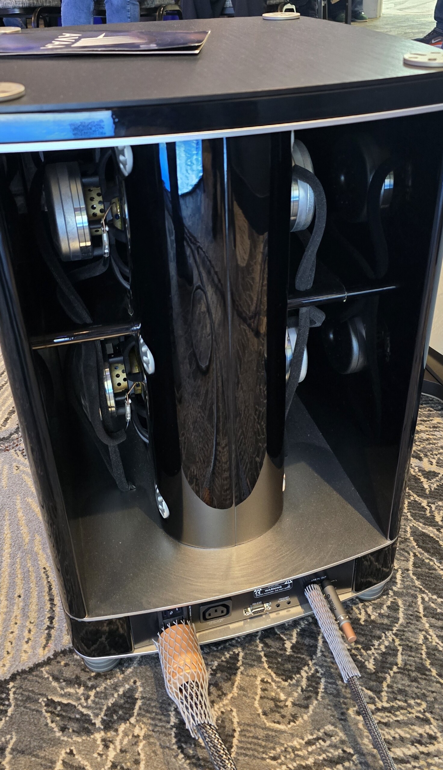 PSI Audio's listening room featured their AVAA C214 active bass traps. Interesting for sure. Bass traps aren't new. Often tall towers covered with a fabric-like material and placed strategically in the listening space, often in the corners, to absorb low frequencies and prevent build-up. Again, usually in the corners where sounds tend to be most reflected. The active bass traps shown here change this. Think of it as noise-cancelling headphones, but for your room. To use the term cancelling is somewhat misleading as the traps don't cancel anything. Rather they absorb, rather than reflect. Each trap has a microphone and will direct the internal drivers to mimic the low frequencies that are detected at 180-degrees out of phase. What makes active traps so compelling is they can absorb different frequencies at different rates depending on what is being presented in real-time to the microphones in the traps. Passive absorbers won't selectively absorb different sounds at different rates of absorption. The demo given in the listening room was persuasive. There were multiple traps set up in the space and they could be selectively turned on and off from a tablet. This made the comparison instantly recognizable. Obviously tracks were selected to best show off the differences with the traps enabled and disabled. Individual traps were switched on/off, then in groups of two, then all four. Any boominess that persisted with the traps off was instantly removed once the traps were switched on. The effect was more pronounced as more traps were added to the mix. Cool product. I was impressed. www.psiaudio.swiss. (707)933-7695