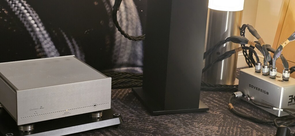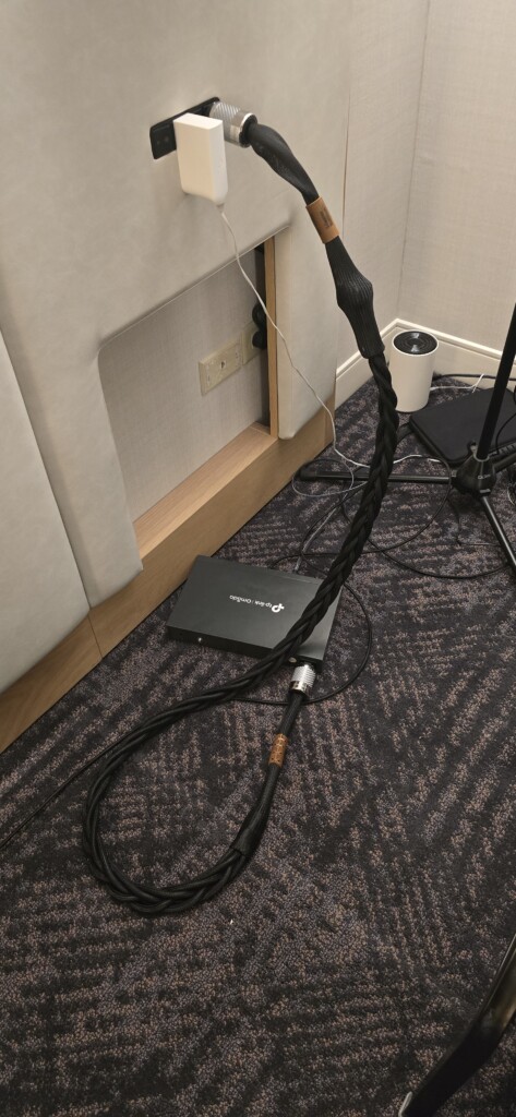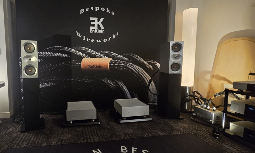 EnKlein Bespoke Wireworks' listening room was decked out with their braided silver conductor cabling. This is perhaps the ultimate in high-end cables. Fully braided and using conductors that are 99.9% silver. These braided cables use so much silver in fact that according to EnKlein if you were to unbraid, unspool, and stretch out the silver from a single cable, you would be left with a silver strand over a mile long! Copper strands are added for strength, but not conductivity. The price on these cables fluctuates constantly due to silver pricing and availability. The price sheet for the show was a QR code. A printed price sheet would likely be out of date before the end of the show! The day I was there, the price for their Master Edition 2.5 meter speaker cable was $50,000. The 1.5 meter cable priced in at $35,000. www.EnKlein.com.