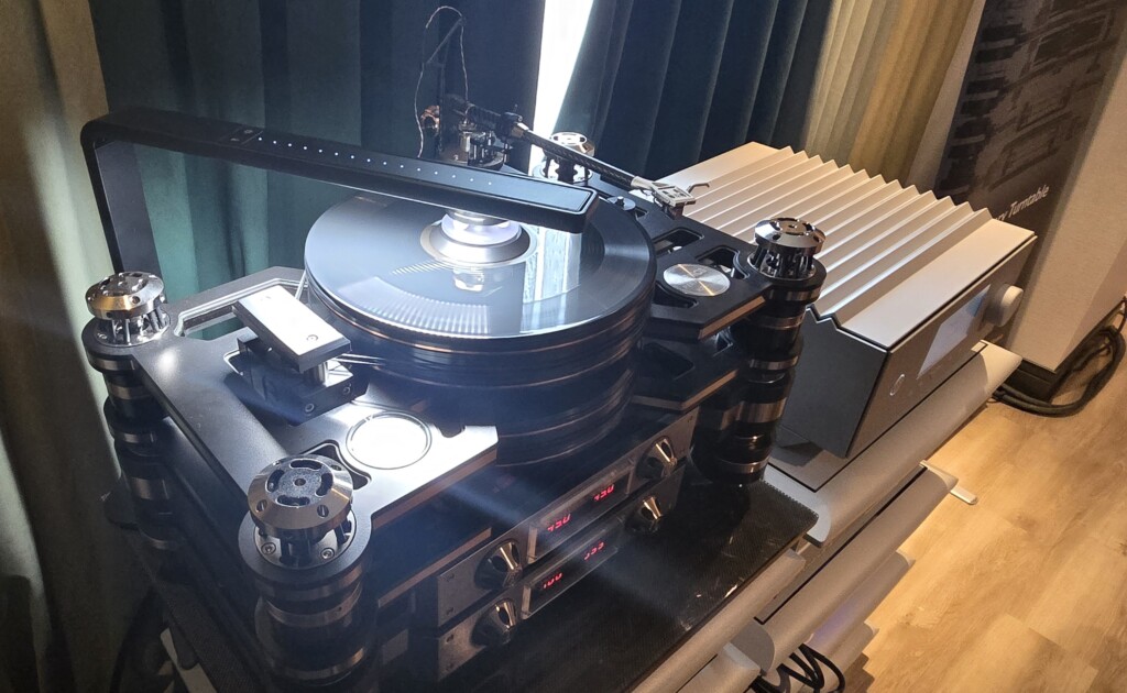 Kronos Perpetual dual-platter counter-rotating turntable with super-capacitor power supply underneath.