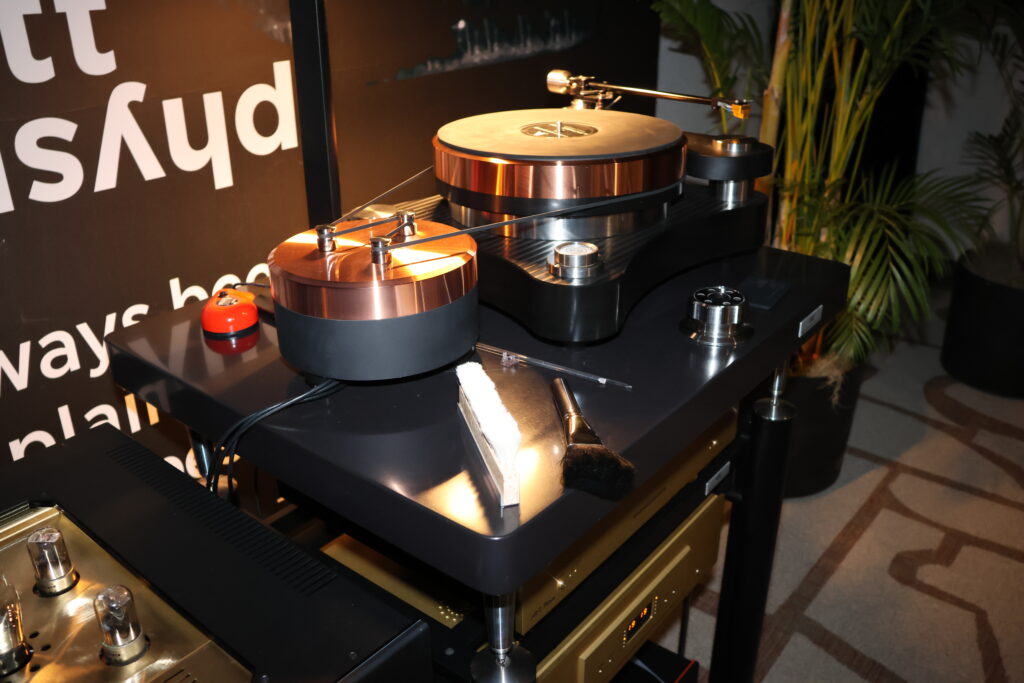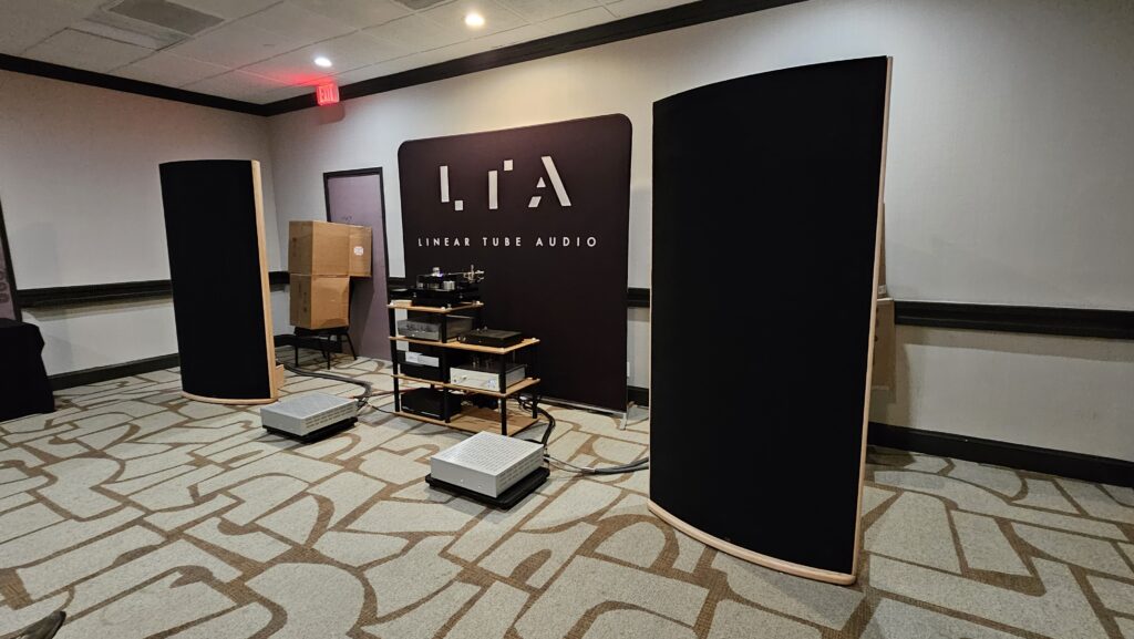 Several new products headlined Dr. Vinyl's room lead by Linear Tube Audio's latest top-of-the-line Century monoblock amplifiers. These transformerless, autobiasing designs develop 110 wpc/8 ohm output using 4 x 6JN6 NOS compactron beam power pentodes per channel. Evaluating the sound was a little difficult here as you really needed to sit dead center for a true soundstage. You also definitely needed to sit further away from these monsters to get a handle on what they can do. So an incomplete here.