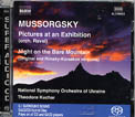 MUSSORGSKY-RAVEL: Pictures at an Exhibition; Night on Bare Mountain (two versions); Hopak; Golitsin’s Exile - National Symphony orchestra of Ukraine/Theodore Kuchar - Naxos Multichannel SACD 6.110061 - 4 stars Oh hum, another Pictures in surround. But a very good one with some interesting fillers. Not quite the snap of the recent Gergiev version on Philips SACD or the warm ambience of the classical Slatkin version on Mobile Fidelity SACD, but both of those are just 4.0 channel and this new one is a full 5.1. The Russian orchestra is clearly quite familiar with the music and gives each picture a thorough inspection instead of just throwing off the notes. The notes say it was mastered in DSD but I don’t think that means the original recording - which was probably PCM. Regardless, the multichannel sonics are better than most of the Naxos DVD-As. The other two SACDs just gave us one version of Night on Bare Mountain but here we get two. The original is two minutes longer than Rimsky-Korsakov’s popular transcription, and though it lacks some of that composer’s noted orchestral colors it sounds somehow fresher, more goulish and also more like other Mussorgsky works. John Sunier