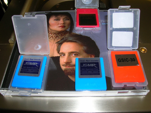 the Red and the Blue While we did try the Soundstage Expander, what I want to report on now are the new incarnations of the Golden Sound Intelligent Chip. Oy vey, I can hear you muttering sub vocé, "The scourge of 2005 is back?" How much fun was that the last time around? Since the pre-Y2K Richard Gray Power Station fracas, more than anything I can think of. Yes, they are back. The new chips look physically identical to their infamous, and highly controversial, forebear. Even the packaging is the same. Only the stick-on label gives it away. Where the original has a silver sticker that says "GSIC-30", or "GSIC-10", the new one simply says "JSMR." However, the application is wholly different. The original GSIC (still around and upgraded, by the way) is used on CDs and its effects are permanent. The new ones are placed on top of transformers and power cords and their effects are completely reversible. They come in two versions: the light Blue is for use on amps; the orangey-Red is for front-end gear. I can merely hope the fracas caused by the original GSIC is not to be repeated. Allen: "Put one of those insignificant, little, weightless, blue wafers on the PC where it enters your amps' IEC plug." Me: "How's it gonna stay on? There's no glue or stickum." "Just do it and stop complaining." "OK, OK, OK, OK." So we got started. On Mozart Violin Concertos, with Fabio Biondi and Europa Galanté (Virgin Classics 94634 47062), the insignificant, little, weightless, blue wafers (1x1.5 inch rectangular pieces of plastic) made themselves known. Four of the Blues went on top of the IEC jacks of the power cords at the point where they entered the Kharma MP150 monoblocks; three Reds similarly went onto PCs of the front-end. After a couple of rounds of on and off, one hones in on their effects: the insignificant, little, weight-less, blue wafers produced noticeably sharper transient attacks and soundstage focus. What—how do they do that??? You actually get a crisper, faster, tighter, and more dynamic presentation. Image borders firmed up, and the corpus inside them became more solid and dense. In the bass, this firming was heard as a propulsive, noticeable, bouncing rhythmic line. The chips also redistributed sound energy, taking some away from the lower mids and moving it downwards into the bass region. All to the good, you would think. However, I wasn't so sure about that. I had a nicely balanced frequency distribution to start with: the chip-induced redistribution caused some lumps and unevenness—Fabio's violin lost some of its patina and acquired an unnatural and disturbing focus. The sound was evidencing a degree of hardness now. Without the chips, the presentation was notably softer, less focused, and more spread. Stage width was more continuous across its span because instrumental borders weren't as demarcated. Dimensional cues were good, and frequency response was nice and even, if favoring the midrange. I liked it better this way, without them: I judged it more natural. in the Land of Can-do I could distinctly hear what was going on in terms of increased soundstage clarity, firmer body, more powerful low-end and reduced treble stridency, stuff that would have been magical elixirs at any other time. Nevertheless, right now, with the rig I had now, it wasn't making the sound better, only different, and possibly worse. This was a case of bad timing. I had recently entered the Land of Can-do. Let me tell you about that, as it is not commonly visited and has even fewer residents. As you, the audio consumer move up the food chain, you need suffer fewer and fewer compromises. With each upgrade more of the pieces fall into place—provided you make good choices and the whole is synergistic. The distance between you and egregious deficits or exaggerations lengthens, and then recedes in the dust of your advance. Then, at some rarified point, you cross a threshold and find yourself in a domain where you stop thinking about the system's shortcomings. It actually starts to resemble the real thing. I know, ‘cause I recently went through that portal. Ah, can you imagine what a relief it is to flip the switch and have the room filled with wonderfully satisfying sound that doesn't beckon to be repaired; to be able to finally jump off the tweak/upgrade treadmill, if only for a short while? Welcome to the Land of Can-do. The rig at the time of auditioning the Blue and Red consisted of the mbl 5011 preamp (and later mbl's big boy 6010D preamp) and two pairs of Kharma MP150 mono-blocks, bi-amping Kharma Exquisite-Midi speakers. This was without doubt the pinnacle for an all solid-state system at Nack Labs. The whole was tied together with TARA Labs power products and their marvelous .8 series of ICs and speaker cable (review next month). At this moment, the need for tweaks was greatly diminished. In fact, I was yanking them out at a ferocious pace because they were counter-productive. This rig didn't need fixing up—every time the chips went in, we went back to the untreated components. (Of course, I still had in a number of specialized footers and room treatments tweaks in, but much less than before.) Try again with a New System I adjusted the equation by swapping in some tube gear to observe the results. With the Lamm L2 Reference preamp (one Red on its PC), and the Art Audio Jota SET amp (three Blues, one on each input transformer and one on the PC), here is what I heard on the Mozart Violin Concertos: crisper transients and a reduction of the midrange dominance. This in turn led to more energy at the frequency extremes, especially in the mid and low bass. The chips cut back some of the warmth and moved the sound closer to neutral. Did it get more dynamic? It certainly sounds more forceful, with more punch on the bottom. Images contracted and became more sharply delineated and more focused. In this second rig, they didn't interfere with the beauty of the string tone. Sounds familiar, right? It should; it's