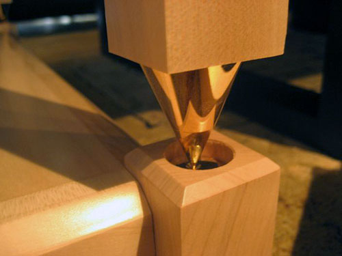 A close-up shot of where the spike sits into the leg. As you can see you use their disks in here as well. The main reason for this is that natural wood will shift a bit depending on the relative humidity… using disks beneath the spikes allows for a secure fit that is adjustable.