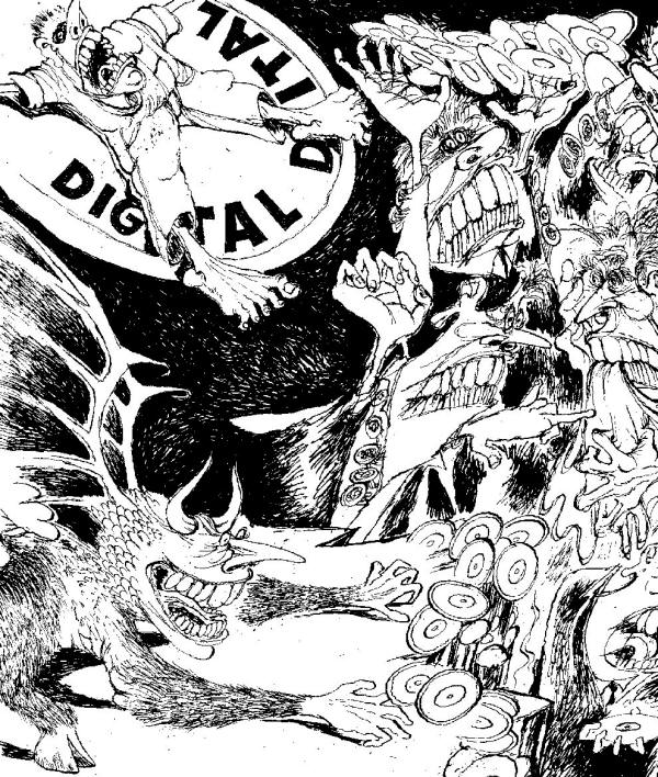 "Digital Hell" (detail), by Bruce Walker There are at least 6 points of degradation that can occur with or without the artist's knowledge. These include: 1) performance to capture-format 2) capture-format to mix-format 3) mix-format to mastering-format 4) mastering-format to approved-master for replication 5) approved-master to label/replicator/digital aggregator 6) God only knows what happens from the label/replicator/digital aggregator to retail, and then on to the consumer If a producer is not careful, it can be twice as many generations from the performance to the home listener. Many producers believe there is a magical world where everyone in the audio chain cares as much as they do, and will preserve the integrity of the music to the end user. More often, there is no control over the fate of the master as it goes from distribution and to the consumer. The ones who care the most about quality are at the beginning and the end of this chain—the artist and music lover. I work with and for people who care about maintaining that quality. Until recently, I have felt my primary raison d'ętre was optimizing the environment so that the artists can perform at their best. If magic is captured with one mic in a noisy bar, so be it. Creating magical performances in the studio is like the Superbowl. The artist has one chance, one day to be great. All bets are placed on everyone being at the top of their game, that there won't be a power outage, a spouse doesn't call with bad news and a new assistant doesn't say the wrong thing (no matter how much they're prepped, you just never know). Artist performance is 90% psychology. The million dollar investment in the studio is nothing without a great performance. I'm often asked how I got into this business. Before becoming an engineer, I was a working musician. Music was a natural career choice having played the piano at the age of four, had a music scholarship for oboe, toured in a jazz ensemble, tuned pianos, studied sitar, and had 60 music students by the time I was 18. Being a recording engineer was never something I aspired to. Then came the "band" years. Teaching music in the daytime, rehearsing and performing 5 nights a week. Then, the band needed a demo...! Like many first-time engineers, I was in a band and we needed a demo tape. Back then, the home studio in a box setups were not an option. Digital recording did not exist. The band spent a lot of money on gear (me and the ex, the drummer) and time setting up the equipment. The story I like to tell at parties is—my relatives from Italy were in town, and the band was left to wire up the gear without me. With a stern, "You're going to learn this stuff!" on my return, I became the band's engineer. What's probably more the truth that kept me behind the board was my background as a music teacher, a curiosity about the physics of sound, sympathy for performers and ability to speak musically to musicians. In six months, with debt over our eyeballs, we opened up to the public, and OTR Studios was born. We were short on names so we honored our band "Out There Orchestra". The associated audio engineering became "Out There Recording," which in turn became "OTR" over the years. It was much easier to not try to explain! We are now the oldest owner founded studio still operating within 100 miles of San Francisco. I've now been a recording engineer, commercial studio owner, and producer for more than 25 years. During that time, I composed commercials for Nissan and AT&T, worked in A&R for Windham Hill Records, pioneered digital download delivery with Liquid Audio in the 90's, engineered more than 400 releases, received 5 Grammy nominations, recorded an Academy Award winning documentary and earned a couple of Gold Records. The band has still never made the demo tape! Labels, Marketing, and Chaos… Working with major record labels is chaos. At Windham Hill, we had a quality control fellow on our staff whose sole job was to protect the integrity of the delivered masters. I wrongly assumed most record labels had someone like that whose only job was to take care of the masters. Sad to say that is not the case. Later, when brokering CD and vinyl manufacturing, we became exposed to ugly situations dealing with manufacturing. It takes an iron will to get a product to market and not have problems. Quality control is very difficult once it leaves the hands of the artist. The other dilemma most great acoustic artists face is the lack of support from marketing at a label. For the most part, the number of albums shipped on the first day was the end of the marketing budget. It was then on to next month's release. Once every ten years you'll get a "Norah Jones" who builds a following the label can't deny, or a George Winston who had 4 albums on Billboard's top 200 for 10 years without a new release. Frustrated by the industry changes, five years ago I started Blue Coast Records, a record label for acoustic music and small ensembles similar to the "unplugged" series on MTV, but with high resolution recording techniques. Starting Blue Coast Records gave us control over the performance choice, sound, delivery, and marketing. My co-producer, Jean Claude Reynaud, is the son of Jean Marie Reynaud who many of you know about. We started Blue Coast as a challenge to create a label with passionate performances combined with great sonics. Jean Claude introduced me to the world of audiophiles. Until we met, I had not been aware that so many people actually cared about the recording quality of music. The artists rarely cared or had the listening environment at home to hear the differences. They spent their money on incredible instruments, which is understandable. I had always felt it my job to capture the sound of that great instrument and their performance as best i could. But could I sell the recordings? After 20 years assembling the studio weapons I needed to record to my satisfaction, digital multi-track recording had all but t