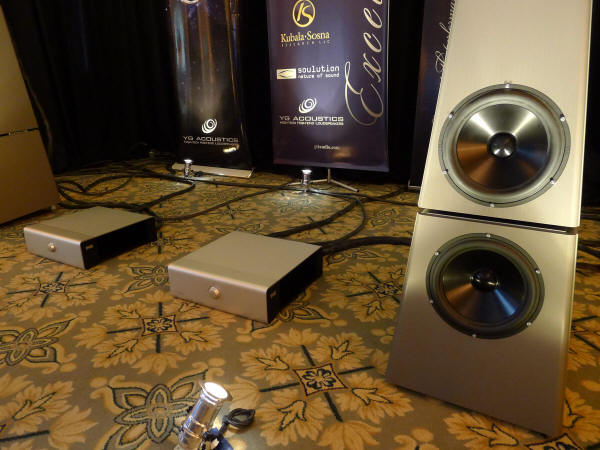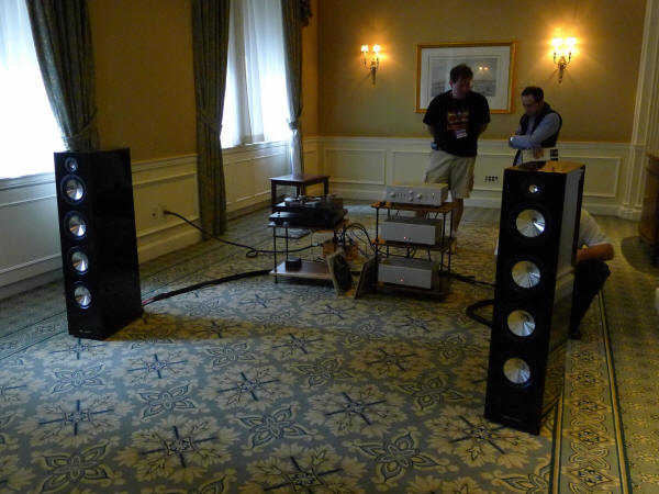 Veloce Veloce, YG Acoustics, Kubala-Sosna, Accuphase Immediately after the Lavry room we went to hear what the guys at Veloce Audio were up to. There was no doubt about coherency here. My duo piano CD, served up on the Accuphase CD600 and Veloce amplification driving the YG Acoustics Kipod II Signature, had a compelling openness yet maintained full control—freedom with control. The smallish Kipods had no problem with large-scale material. Note: this wasn't the case when we visited the day before. Back then the sound was bass heavy and closed in on top. On Sunday morning, it was obvious some Rx had been applied—the replacement of the WBT speaker jumpers with a pair of K-S Emotion! jumpers, plus another day of burn-in time. These made all the difference.