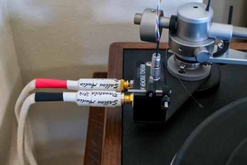 Joseph says there's been quite a bit of debate in the cable community about which jacketing to use on cables. In tests Joseph has compared nude designs (no jacketing), Teflon jacketing of various diameters, and cotton jacketing. What he found out that was no jacketing sounded best, cotton was next best, and a 28 gauge Teflon jacket was the worst sounding. The sound quality was related to the dielectric constant of the jacketing used, and Joseph found that as the dielectric constant decreased the sound became much more open and the test system projected a much larger sound stage. As you probably have surmised, no jacketing (air) had the lowest dialectic constant, cotton was the next lowest, and Teflon was the highest. Joseph liked the way the cotton jacketing sounded, but he didn't like the way it allowed electrical noise into the signal conductors (as dielectric constant goes down the noise can go up if there are noise sources close by). You can twist the conductors to help reduce noise, but with cotton noise can still become an issue. Joseph came up with a way to 'trick' the conductors into thinking they were surrounded by air while still maintaining the insulating properties of the Teflon. The answer was using oversize Teflon tubing to make the conductors think they were surrounded by air (which is actually the case when there's lots of space in the big Teflon tube), and then twist them to further increase noise rejection. (I'm guessing that's where the name "Big Twist" comes from. Big tubing. Twisted conductors. Big Twist. Get it?) Joseph found a sweet spot with oversize 8 gauge Teflon tubing, which gave lots of air space around the conductor, and closely matched performance of cotton jacketing in openness and sound stage size, while still retaining the insulating properties Teflon. The only way you can make cables highly resistant to noise contamination is to use copper braid shielding with a shield to ground connection. The only problem is that shielding tends to decrease sound quality by reducing air and transparency and restrict frequencies above 10kHz. At this point Joseph feels that the losses incurred by using shielding don't make up for the benefits, so the Big Twist cables will remain unshielded unless Joseph can find a way to add shielding that has no sonic downside. Joseph really likes the WBT-0102Ag NextGen locking RCA plugs. The WBT RCAs use pure silver conductors that are platinum-plated to reduce oxidation. They utilize a platinum-plated brass body with a central contact assembly made from high-tech polymers: Ultramid for the central contact and Duneon for the negative contact. The barrel is fabricated from brass and coated with black piano lacquer. WBT says the transmission bandwidth extends to 1 GHz, and it has 75-Ohm impedance that works great for both digital and analog. Ok, so there you have it: the Aurum Ag Big Twist interconnects are a purist design incorporating 28 gauge 24-Carat gold signal wire and 4N 30 gauge silver wire for the return. They're wrapped in 8 gauge Teflon tubing that is intended to mimic an air dielectric, and then they're twisted to aid with noise rejection. They're terminated with ultra-quality WBT RCAs. The 1-meter long Aurum AG Big Twist 28 gauge interconnects terminated with WBT-0102Ag NextGen locking RCA plugs that I have in for review sell for $656 USD. Not bad when you consider that the WBT RCAs alone retail for $348 USD for a set of 4. Preliminaries For this review I used my Review System 1 which consists of an EMT TSD-15 phono cartridge mounted on a VPI Classic turntable, a New Valve Order SPA-II phono stage, a Leben RS-100 line preamplifier, Sophia Electric 91-01 or Fi 300B mono amplifiers, and Tannoy Westminster Royal SE loudspeakers. During the review period the Leben preamp, 300B mono amps, and Westminster loudspeakers were replaced with the Tann0y Kingdom Royal loudspeakers and the ASR Audiosysteme Emitter II Exclusive Version Blue four-chassis integrated amplifier that are in for review. Interconnects were largely Sablon Audio Panatela or Acoustic Revive, speaker cables were Auditorium 23, and power cords were a mixture of Sablon Audio and Acoustic Revive. I also use quite a number of the very effective Acoustic Revive accessories to optimize performance of the system in my primary listening room (1, 2, 3, 4, 5, 6, 7, 8).
