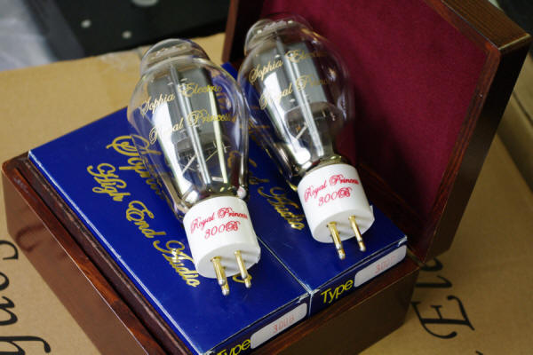 Sophia Electric Royal Princess 300B ($1200 USD per matched pair) "We have been working on refining the design since 2005, and in January 2011 we introduced the Royal Princess 300B which is our finest design to date. From the outside the Royal Princess 300B looks much like the Carbon-Plate 300B, however, the sound is dramatically different. We have combined the best characteristics of the mesh-plate and the carbon-plate designs. The Royal Princess 300B has even more mid-range magic than the Carbon-Plate Princess 300B, combined with the airy top and fine detail resolution of the Mesh-Plate Princess 300B, along with a strong vintage Western Electric-like mid-range sonic flavor. I think the Royal Princess as a new production vacuum tube not only has the vintage mid-range magic of the original Western Electric, but also betters it in the highs and lows. I think with the Royal Princess 300B tubes we have produced are the finest 300B vacuum tubes that have ever been made."