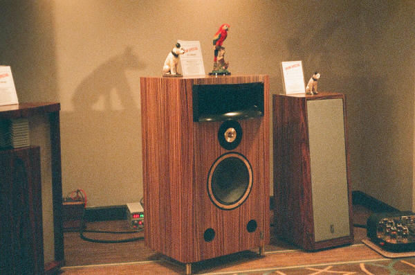 There were a LOT of other speaker systems on display and I didn't have a chance to properly listen to most of them in my mad rush from booth to booth, so don't blame me if I forgot your favorite. There was one speaker company doing a demo with playback off a turntable that had a severe hum in it. Come on, guys. If you can't get it even THAT right, turn it off. REPLICAS Two big vendors were selling replicas of classic speaker designs, both of them beautifully constructed. Volti Audio was showing off their Alura speaker, which was a magnificent replica of the Klipschorn built of rosewood-veneered Baltic birch. A short distance away, Classic Audio was selling beautiful replicas of the JBL Hartsfield, also in a magnificent rosewood finish.