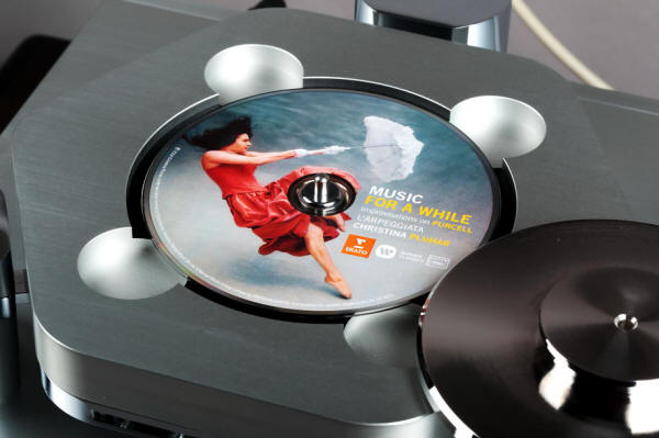 The CD is placed on the platter through a thick metal spindle and clamped from the top with a 460g heavy "stabilizer". The whole looks like a turntable platter and bearing assembly, with a long spindle that extends far below the point of support, has a large diameter and is quite heavy.