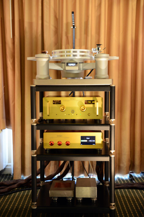 Simply put, the sound in this room was exceptional, allowing the usual margin for show conditions. I am quite familiar with these product lines, with the exception of KLAUDiO's Ultrasonic Record Cleaner, but some exciting and important new designs were in evidence. darTZeel's brilliant designer, Hervé Delatraz, had just presented his new reference LHC-208 DAnalogue streaming Ethernet DSD DAC with integrated amplifier, as well as his new version of his outstanding NHB-18NS reference preamp. Speakers were the Evolution Acoustics MMMiniTwo's, with TRSC, TRPC, and The Link cables doing the hookup. The turntable was the world-class Wavestream Kinetics NVS, with the new Durand Kairos Tonearm, and the Ortofon Anna MC.
