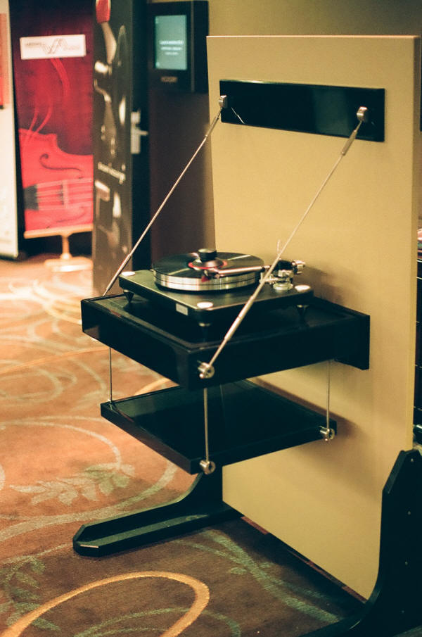 Now, one of the problems with listening to loudspeakers at the show, as you might expect, is the terrible quality of the listening rooms. Vendors don't really have any control over the rooms that the hotel provides, but they do have the ability to do some room tuning to make the best of a bad situation. Command Performance AV was showing off a wide variety of acoustic absorbing devices from Vicoustic and they definitely made a big difference in their demo room, dealing well with some of the slap echo issues from the windows which plague all of these rooms. Another acoustical company, GK Acoustics, was showing off some products in a couple of demo rooms. These guys have a wide variety of different acoustical devices for different applications, from absorbers and diffusers to tuned absorbers to deal with specific room resonances. I talked with their guys and they seemed very interested in actually helping people fix room problems rather than just selling product as quickly as possible. They offer a free consulting service to help people understand acoustical issues in their rooms and while you might expect them to be a little biased toward their own products, certainly getting a little acoustical advice on your room is the first step toward better sound. I think this is the most neglected part of the whole playback system and that a few dollars spent on the room will do more than a lot more money spent elsewhere in the chain. Other things you can hang on the walls next to your acoustical absorbers is the Tana turntable shelf from Kanso Audio Furniture. This is a very ingenious isolation platform for the turntable that hangs off your wall. Kanso had a wide variety of audio stands and furniture for sale and a fine demo set up in the lobby, but the turntable shelf was just so eye-catching I hardly had time to see the rest of it because I spent to much time tapping on it and marveling.