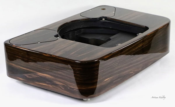 Artisan Fidelity hand selects the Macassar Ebony hardwood veneer, and using a combination of veneer and plank wrap are applied to plinth's exterior surfaces. Internally, the plinth's surrounding cavities are seal coated using high-grade synthetic sealers, which he says provide the benefit of long lasting structural durability and internal strength.